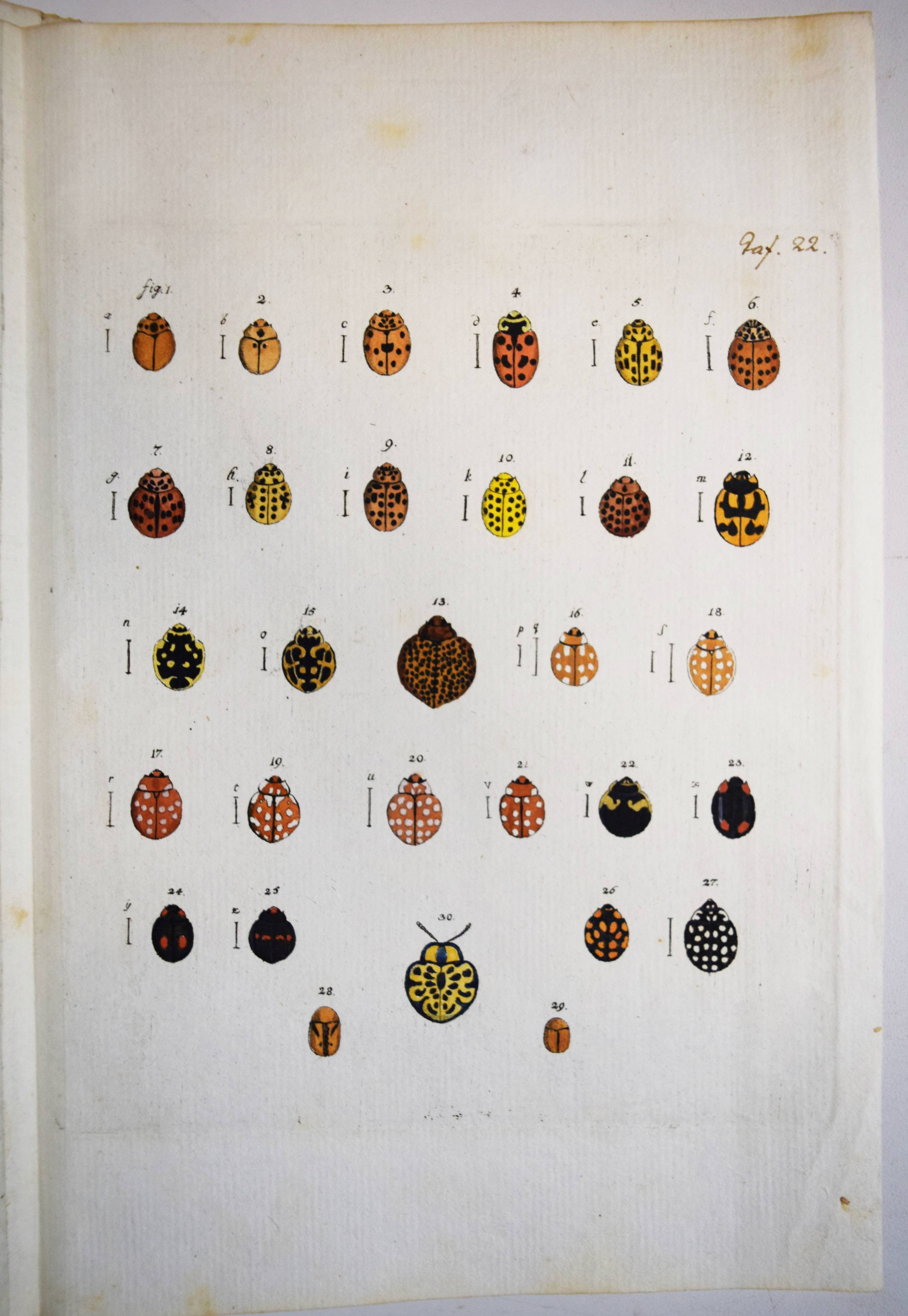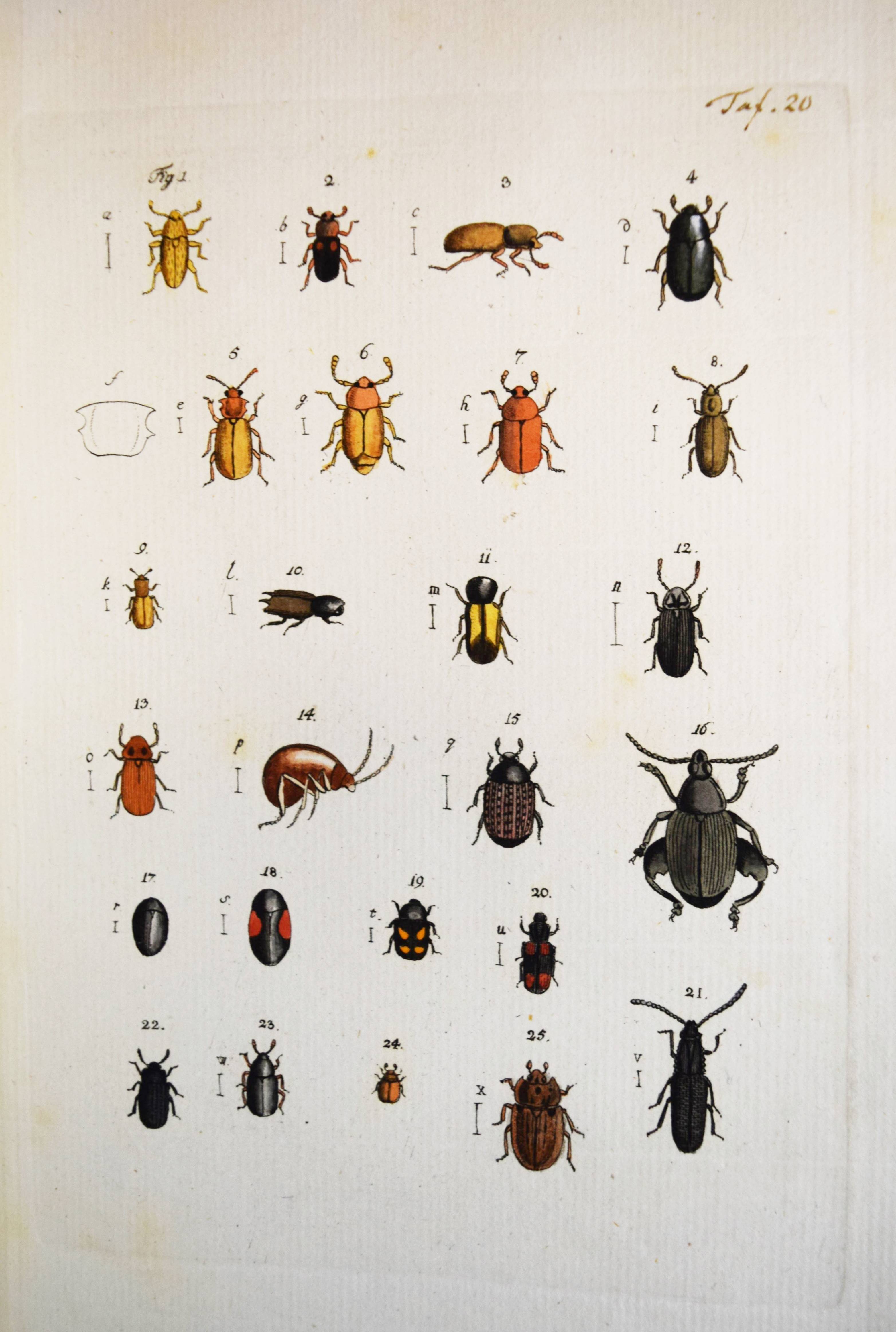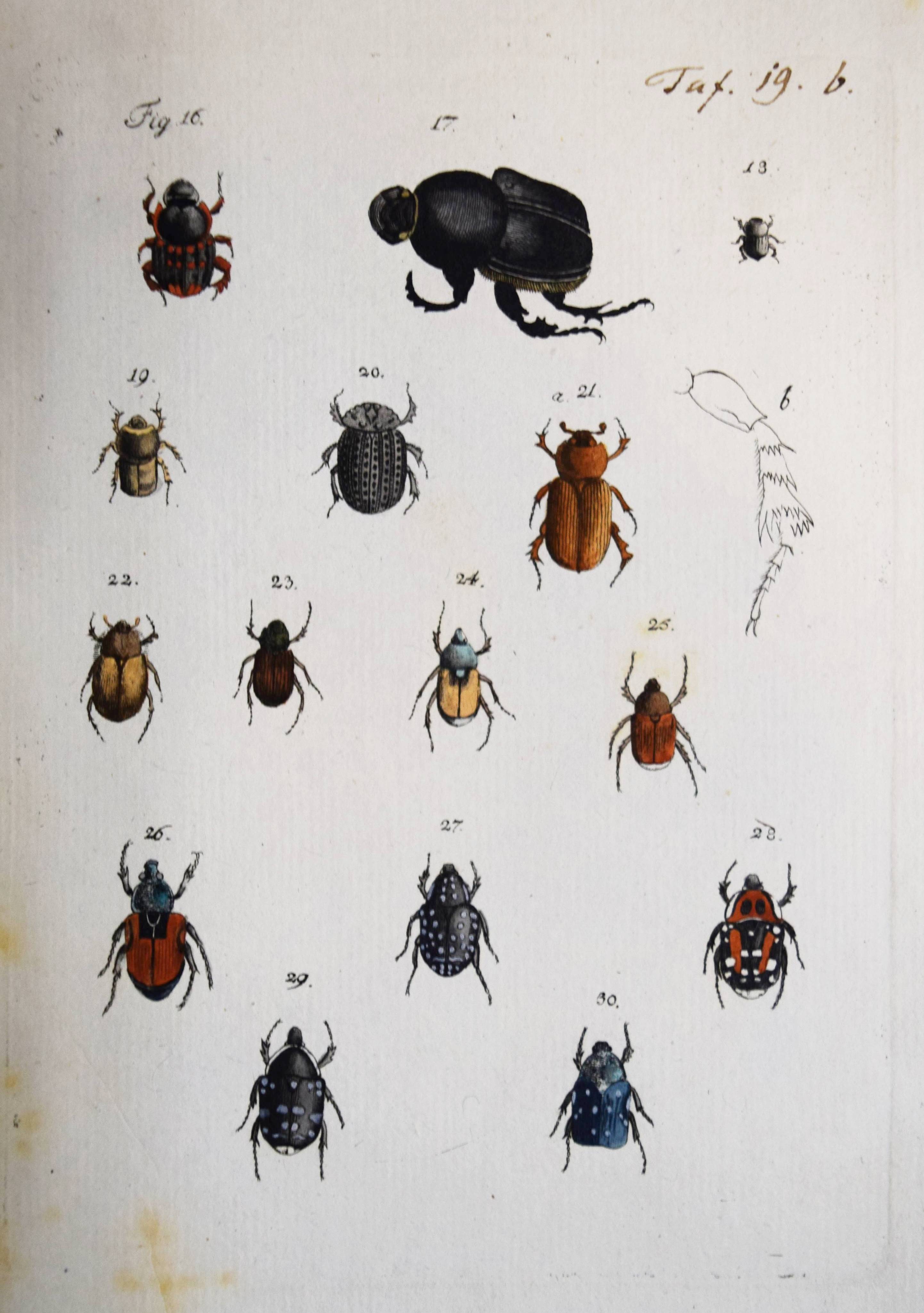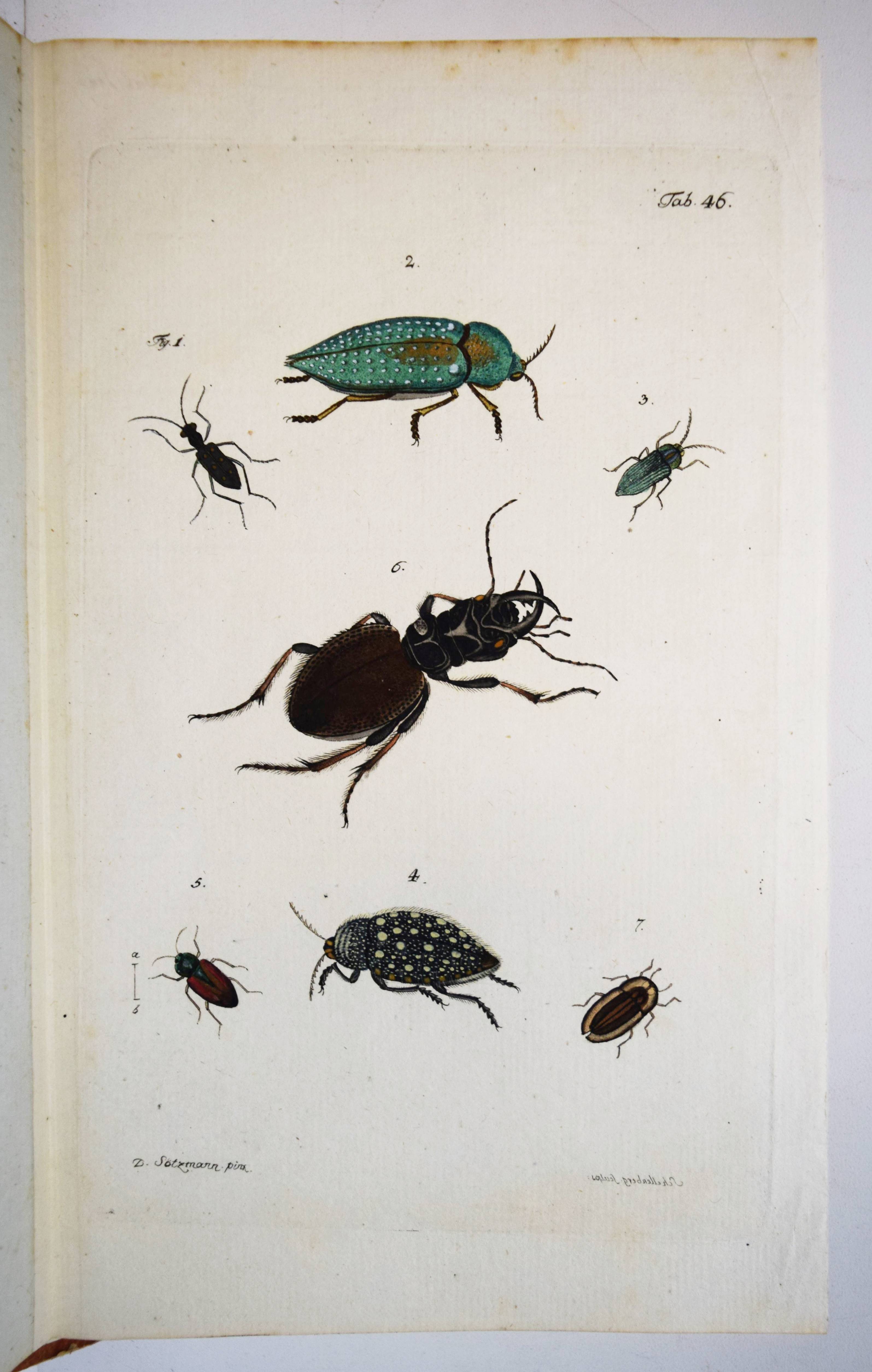 Füßly, (Fuessli), Johann Caspar. (Archiv der Insectengeschichte). Heft 1-8 (mehr nicht erschienen) in 1 Band. (Zürich, Winterthur, 1781-1786). Gr.-8° (24 x 19,5 cm.). 6, 6, 4, 3, 2, 8, 2, 8, 3, 2, 3, 4, 14, 2, 4, 4, 2, 4, 2, 2, 196, 31 S. und 50 (statt 51, 45 handkolorierte) Kupfertafeln von Johann Rudolf Schellenberg. Pappband der Zeit mit 2 goldgepr. Rückenschildern. Hagen I, 257, 10 (nur 50 Tafeln). Horn-Schenkling 7210 (Koll. etwas abweichend; irrtüml. 52 Taf., obwohl einzeln 51 angegeben). Nissen, ZBI 1455. – Erste Ausgabe des schönen, seltenen Werkes. – Neben dem Herausgeber J. C. Fuessly (1743-1786, Entomologe und Buchhändler in Zürich) wurden namhafte Entomologen der Zeit für die Mitarbeit gewonnen, darunter J. F. W. Herbst, Hübner, Dahl, Franz von Paula Schrank und O. F. Müller. Herbsts Beschreibung seiner großen Insektensammlung bildet einen Schwerpunkt der Veröffentlichung, die nach dem Tode des Herausgebers nicht fortgesetzt wurde. – J. R. Schellenberg (1740-1806) „fertigte schon 1753 zahlreiche Insektenabbildungen für den Naturforscher Johannes Gessner an. Abgesehen von einem Aufenthalt in Basel 1763-64, lebte er bis 1801 in Winterthur, von wo aus er Reisen durch die Schweiz unternahm. Der gesuchte Illustrator, dessen Darstellungen sich durch Natürlichkeit auszeichnen, arbeitete u.a. für Johann Heinrich Sulzer, Johann Bernhard Basedow, Johann Kaspar Lavater und Johann Kaspar Füssli. Ab 1795 betätigte er sich wieder vermehrt als Aquarellist und Insektenmaler. Die Winterthurer Stadtbibliothek besitzt ca. 4’000 seiner Insektenaquarelle“ (Karin Marti-Weissenbach in HLS-Online). – Die Tafeln Nr. 37 bis 42 sind nicht erschienen; im vorliegenden Exemplar fehlt die Tafel Nr. 5 (Silbermönch, Phalaena argentea). – Rücken restauriert, Textteil teils etwas braunfleckig, gutes Exemplar.