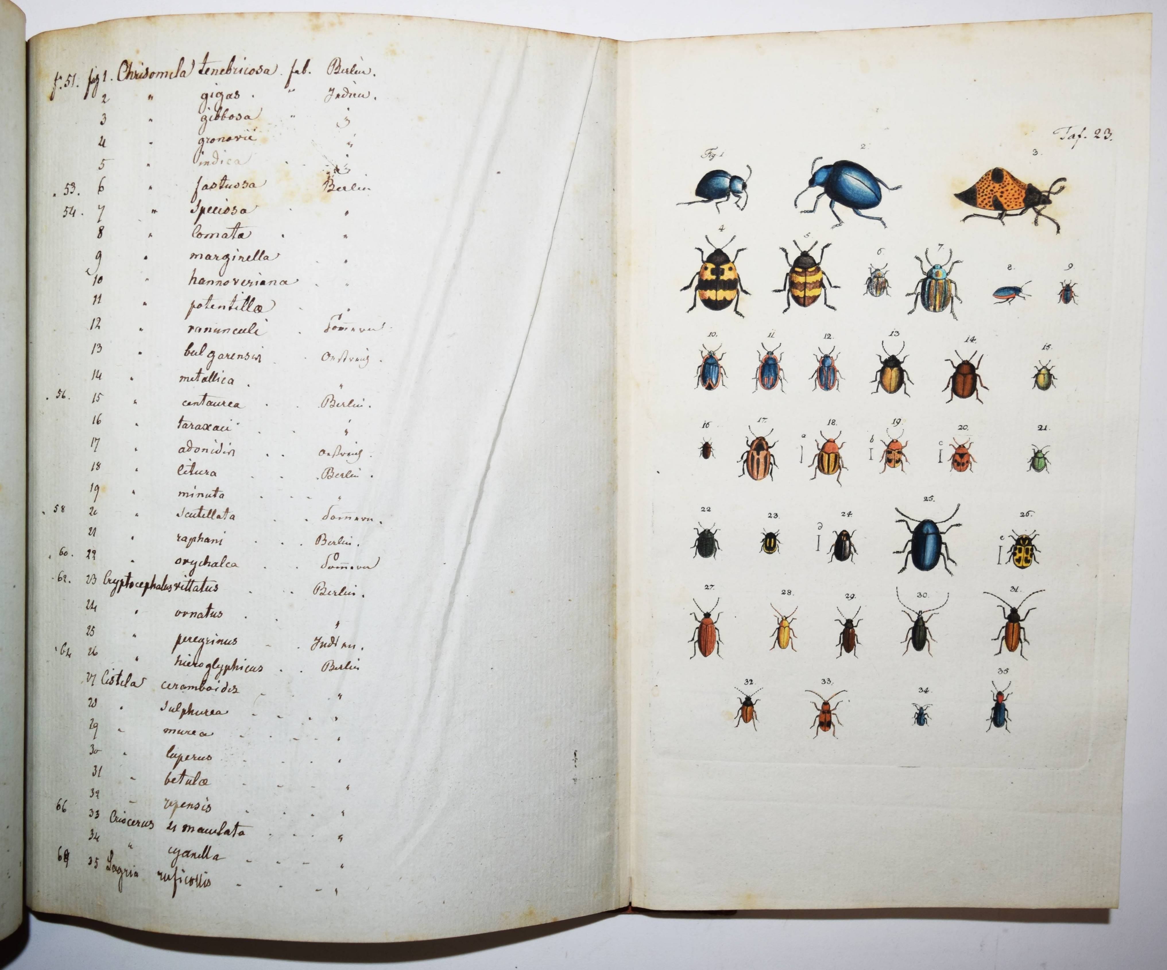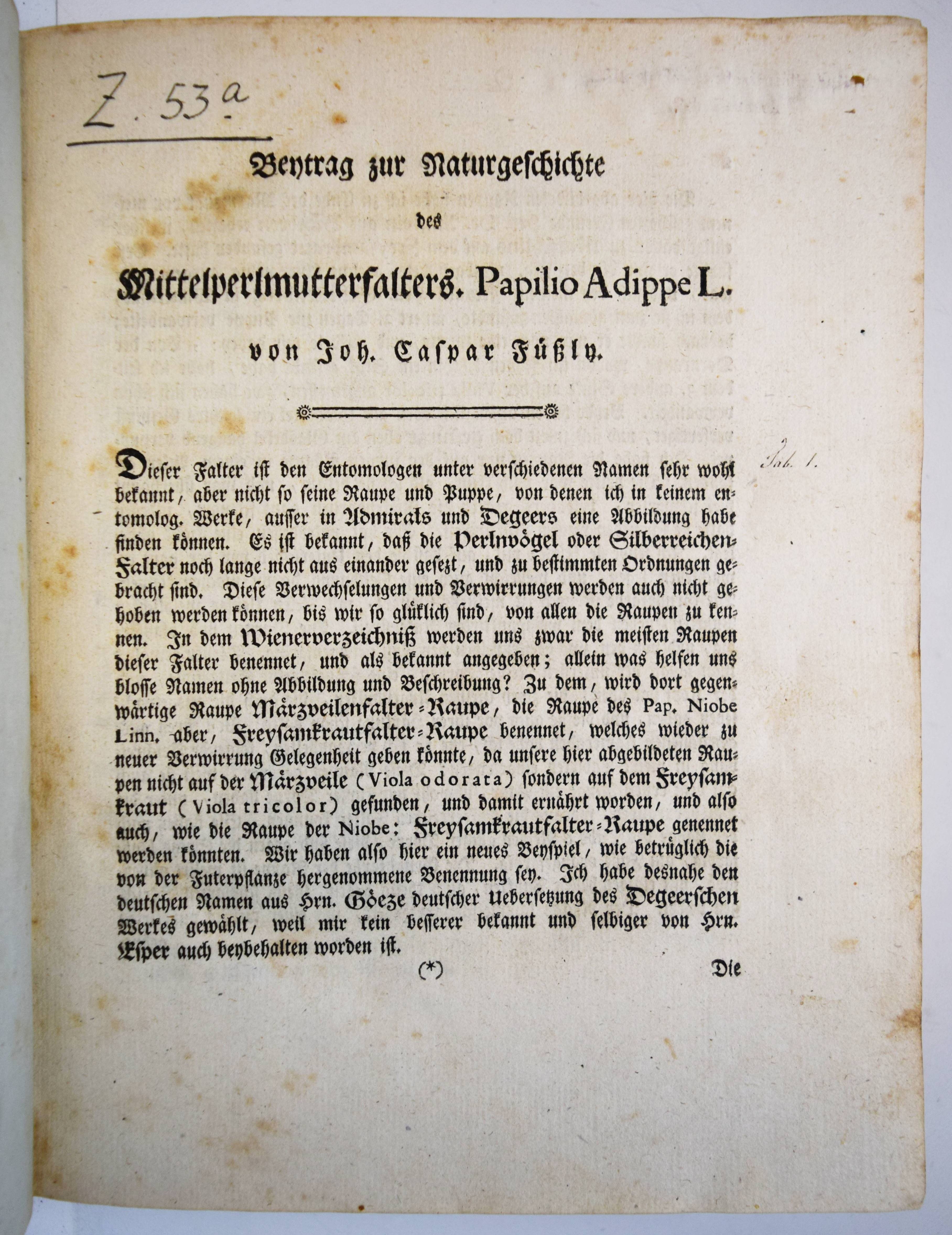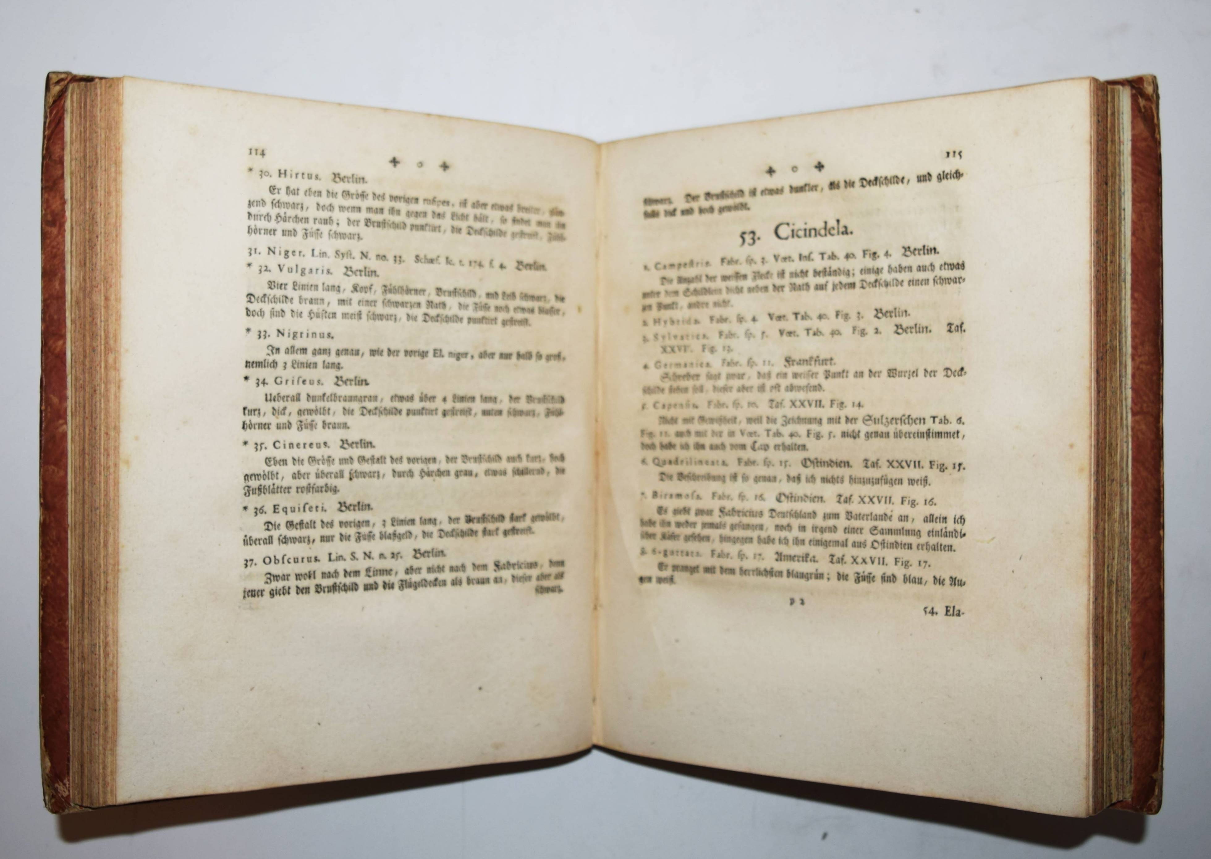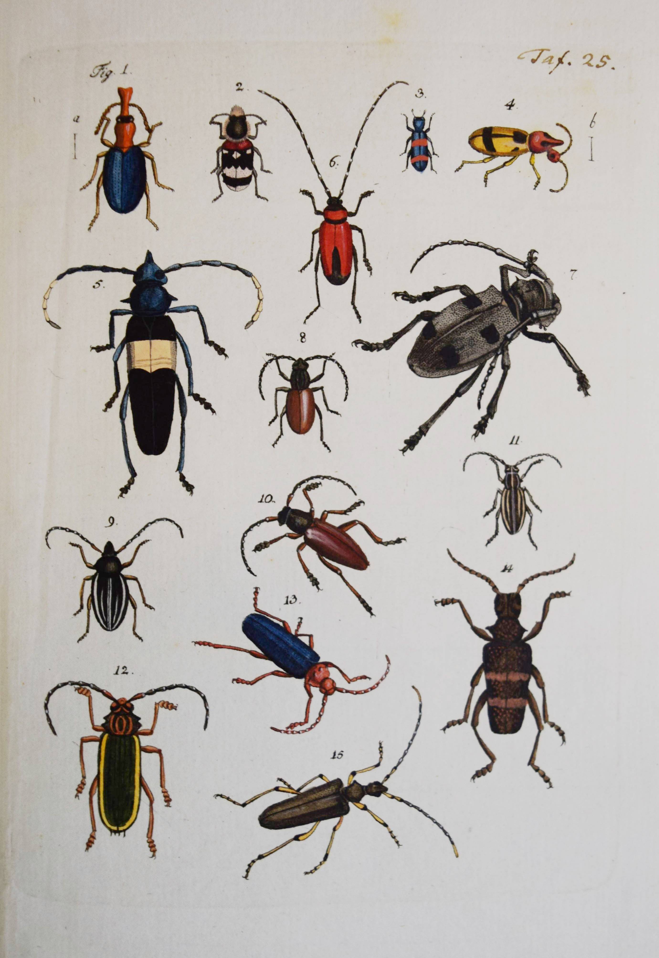 Füßly, (Fuessli), Johann Caspar. (Archiv der Insectengeschichte). Heft 1-8 (mehr nicht erschienen) in 1 Band. (Zürich, Winterthur, 1781-1786). Gr.-8° (24 x 19,5 cm.). 6, 6, 4, 3, 2, 8, 2, 8, 3, 2, 3, 4, 14, 2, 4, 4, 2, 4, 2, 2, 196, 31 S. und 50 (statt 51, 45 handkolorierte) Kupfertafeln von Johann Rudolf Schellenberg. Pappband der Zeit mit 2 goldgepr. Rückenschildern. Hagen I, 257, 10 (nur 50 Tafeln). Horn-Schenkling 7210 (Koll. etwas abweichend; irrtüml. 52 Taf., obwohl einzeln 51 angegeben). Nissen, ZBI 1455. – Erste Ausgabe des schönen, seltenen Werkes. – Neben dem Herausgeber J. C. Fuessly (1743-1786, Entomologe und Buchhändler in Zürich) wurden namhafte Entomologen der Zeit für die Mitarbeit gewonnen, darunter J. F. W. Herbst, Hübner, Dahl, Franz von Paula Schrank und O. F. Müller. Herbsts Beschreibung seiner großen Insektensammlung bildet einen Schwerpunkt der Veröffentlichung, die nach dem Tode des Herausgebers nicht fortgesetzt wurde. – J. R. Schellenberg (1740-1806) „fertigte schon 1753 zahlreiche Insektenabbildungen für den Naturforscher Johannes Gessner an. Abgesehen von einem Aufenthalt in Basel 1763-64, lebte er bis 1801 in Winterthur, von wo aus er Reisen durch die Schweiz unternahm. Der gesuchte Illustrator, dessen Darstellungen sich durch Natürlichkeit auszeichnen, arbeitete u.a. für Johann Heinrich Sulzer, Johann Bernhard Basedow, Johann Kaspar Lavater und Johann Kaspar Füssli. Ab 1795 betätigte er sich wieder vermehrt als Aquarellist und Insektenmaler. Die Winterthurer Stadtbibliothek besitzt ca. 4’000 seiner Insektenaquarelle“ (Karin Marti-Weissenbach in HLS-Online). – Die Tafeln Nr. 37 bis 42 sind nicht erschienen; im vorliegenden Exemplar fehlt die Tafel Nr. 5 (Silbermönch, Phalaena argentea). – Rücken restauriert, Textteil teils etwas braunfleckig, gutes Exemplar.