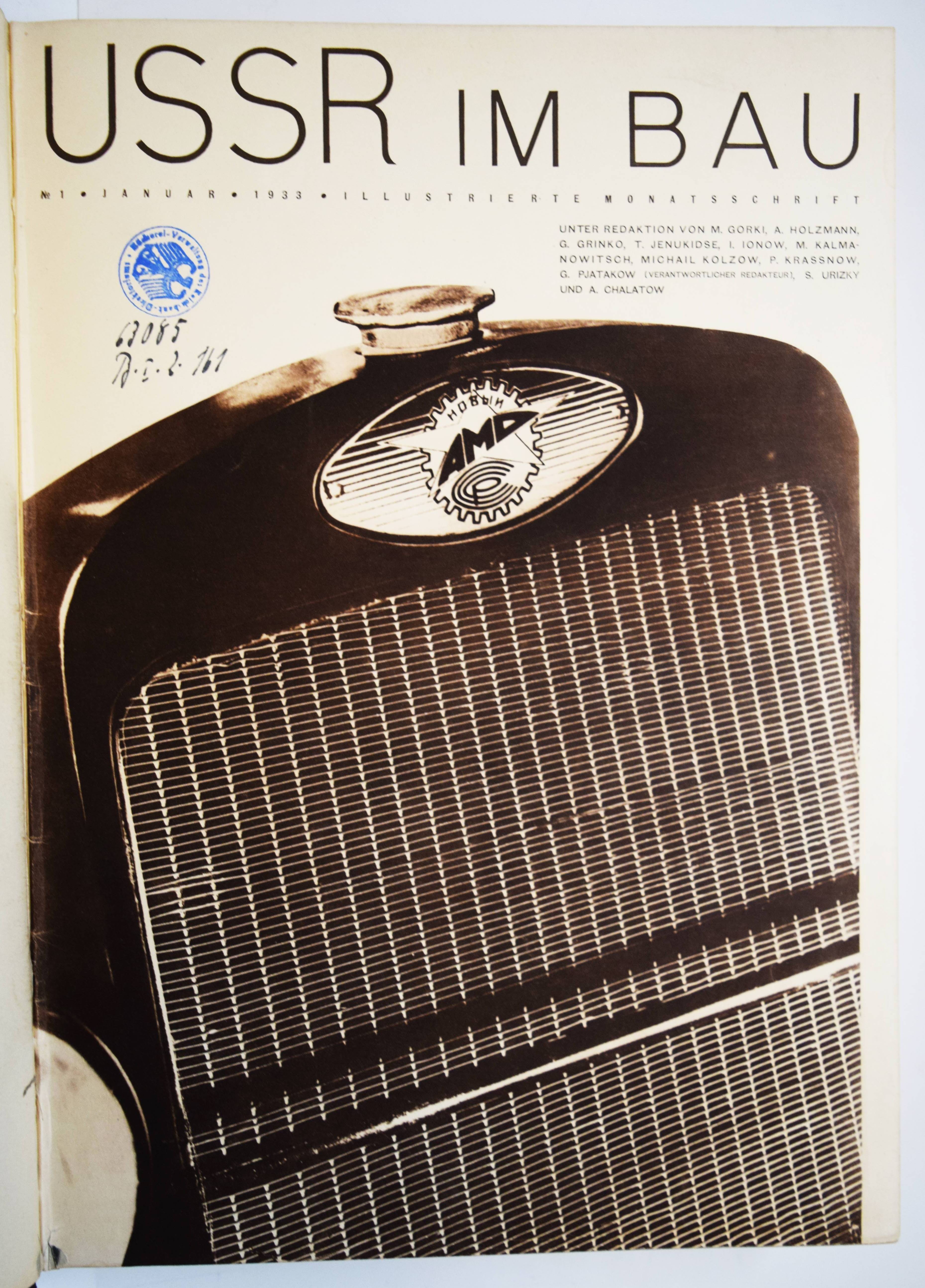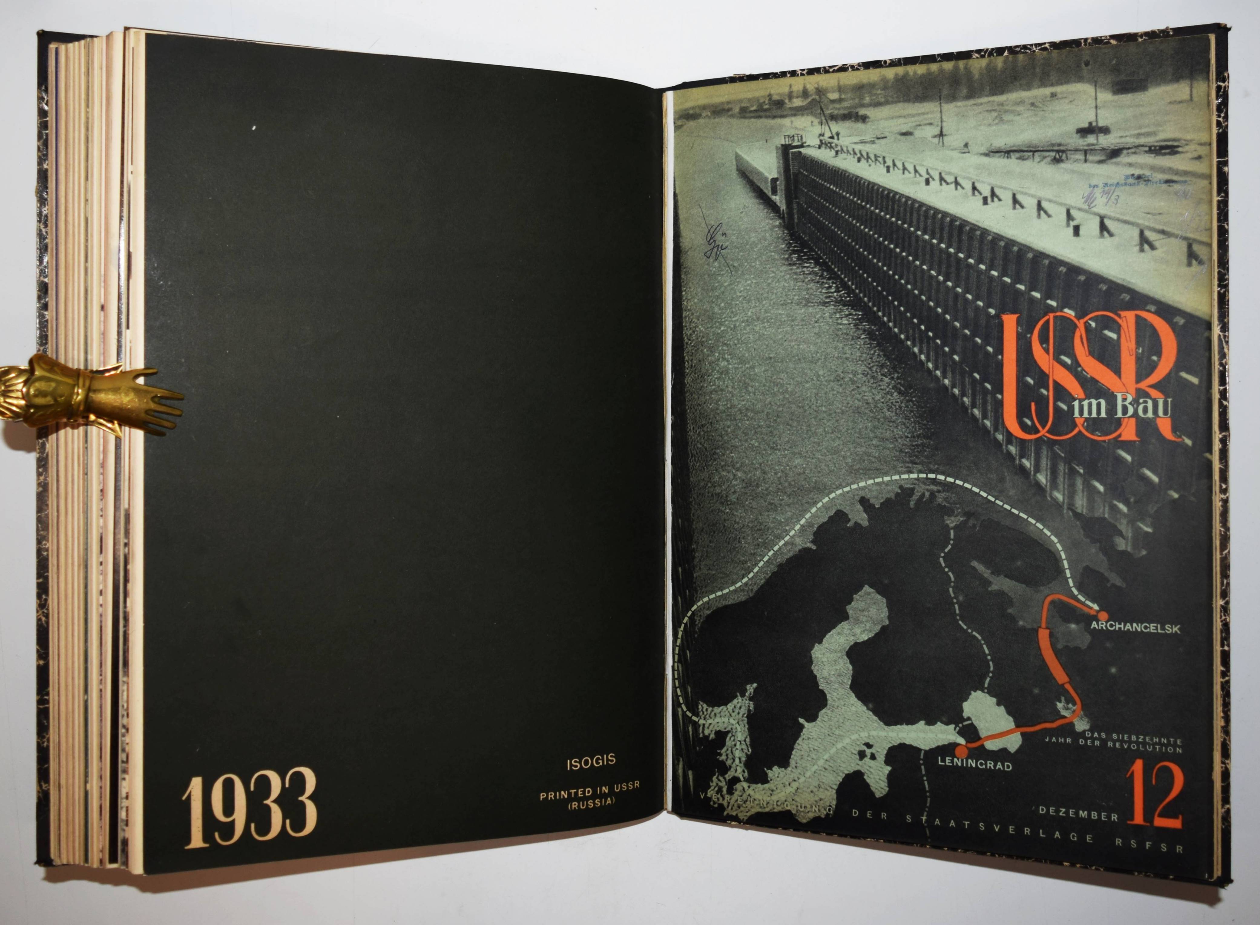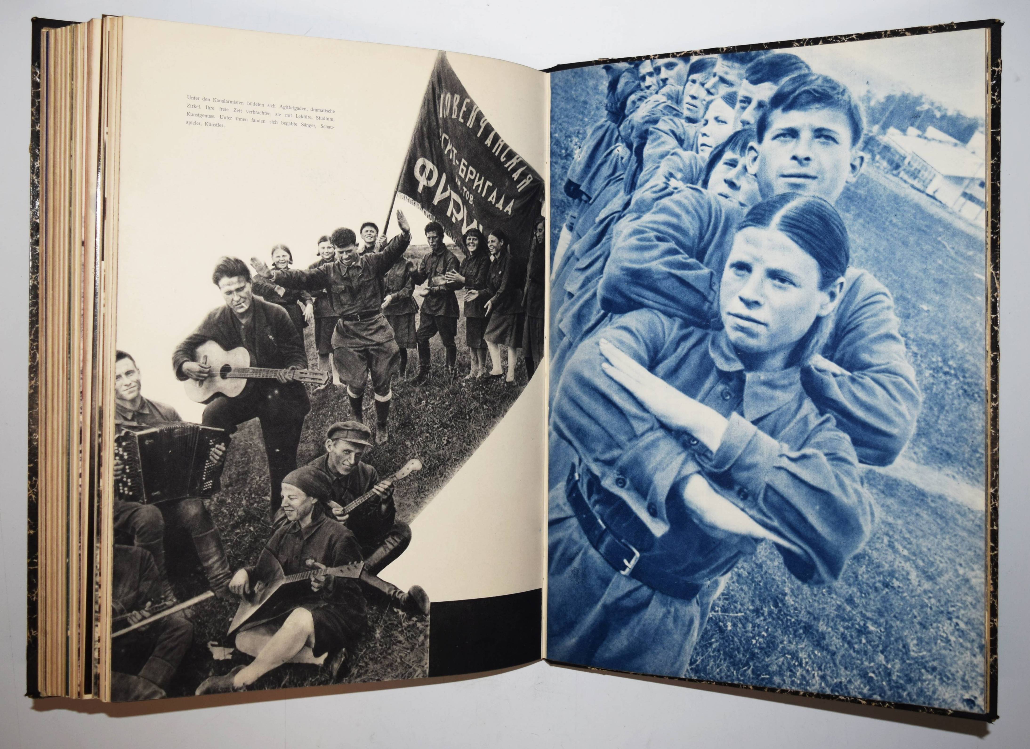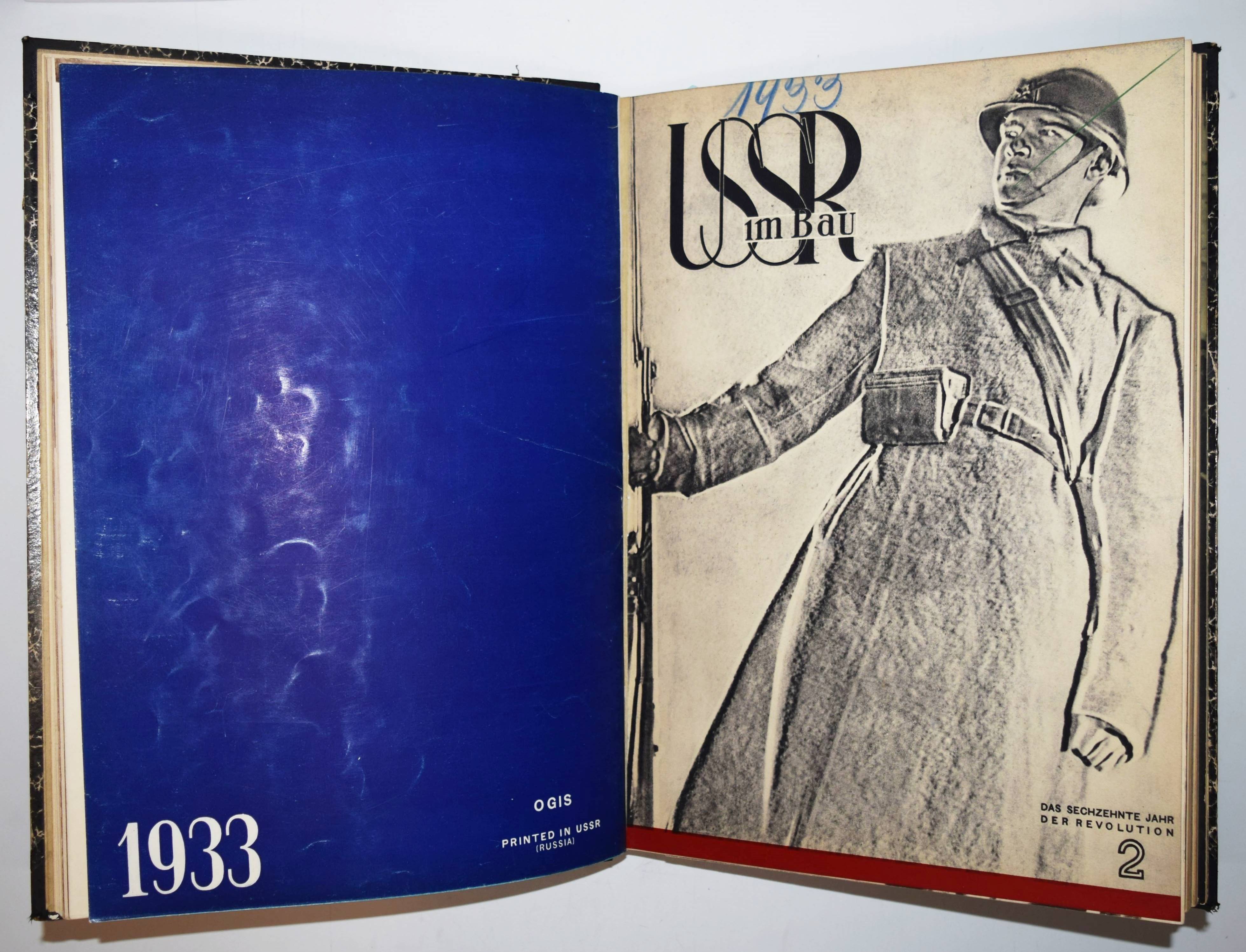 Pjatakov, G(eorgi Leonidowitsch, Editor in Chief). USSR im Bau. Illustrierte Monatsschrift. (Dritter Jahrgang) 1933. 12 Hefte in 1 Band. Moskau, State Publishing House of the RSFSR 1933. Folio (43 x 30 cm.). Mit zahlreichen Abbildungen, teils auf gefalteten Tafeln.. Halbleinenband der Zeit mit goldgepr. Rückenschild (Orig.-Umschläge beigebunden). Hellyer 860. Karasik/Heiting 17 ff. Rowell/Wye 242 f. – Dritter Jahrgang des wichtigsten sowjetischen Propagandamagazins. Mit zwei von El Lissitzky und einer von A. Rodschenko gestalteten Nummern. Die Zeitschrift erschien von 1930 bis 1949 monatlich in fünf Sprachen (Russisch, Englisch, Französisch, Spanisch und Deutsch). Jede Ausgabe war einem anderen Thema gewidmet, beispielsweise Lebensmittel- und Industrieproduktion, der Republik Georgien, dem sowjetischen Kino und Wahlen. – „In the early 1930s photo-reportage became the foundation of the magazine USSR in Construction that „was created as a publication for the popularization of large-scale construction projects by photographic means. But as the magazine grew and developed, the task of ‘popularization’ evolved into that of presenting Socialist reality with dramatic artistry.“ (L. Mezhericher, „Na putiakh k sotsialisticheskomu stiliu fotografii” [“On the way to a Socialist style of photography“], No. 2, p. 14). Well known Soviet designers and photographers worked on USSR in Construction. The industrial spirit of the magazine, expressed in compositionally sharp subjects, panoramas and dynamic shots evokes admiration even today and conveys the atmosphere of enthusiasm that carried along not just the photographers, but also the builders themselves. The creative scale of the construction engendered the photographic epic, a style of monumental artistic photography. The founders of this most successful and high-quality periodical were Gorky and Koltsov“ (Mikhail Karasik). – Umschläge teils etwas berieben, sonst von leichten Gebrauchs- und Altersspuren abgesehen sehr gut erhalten.