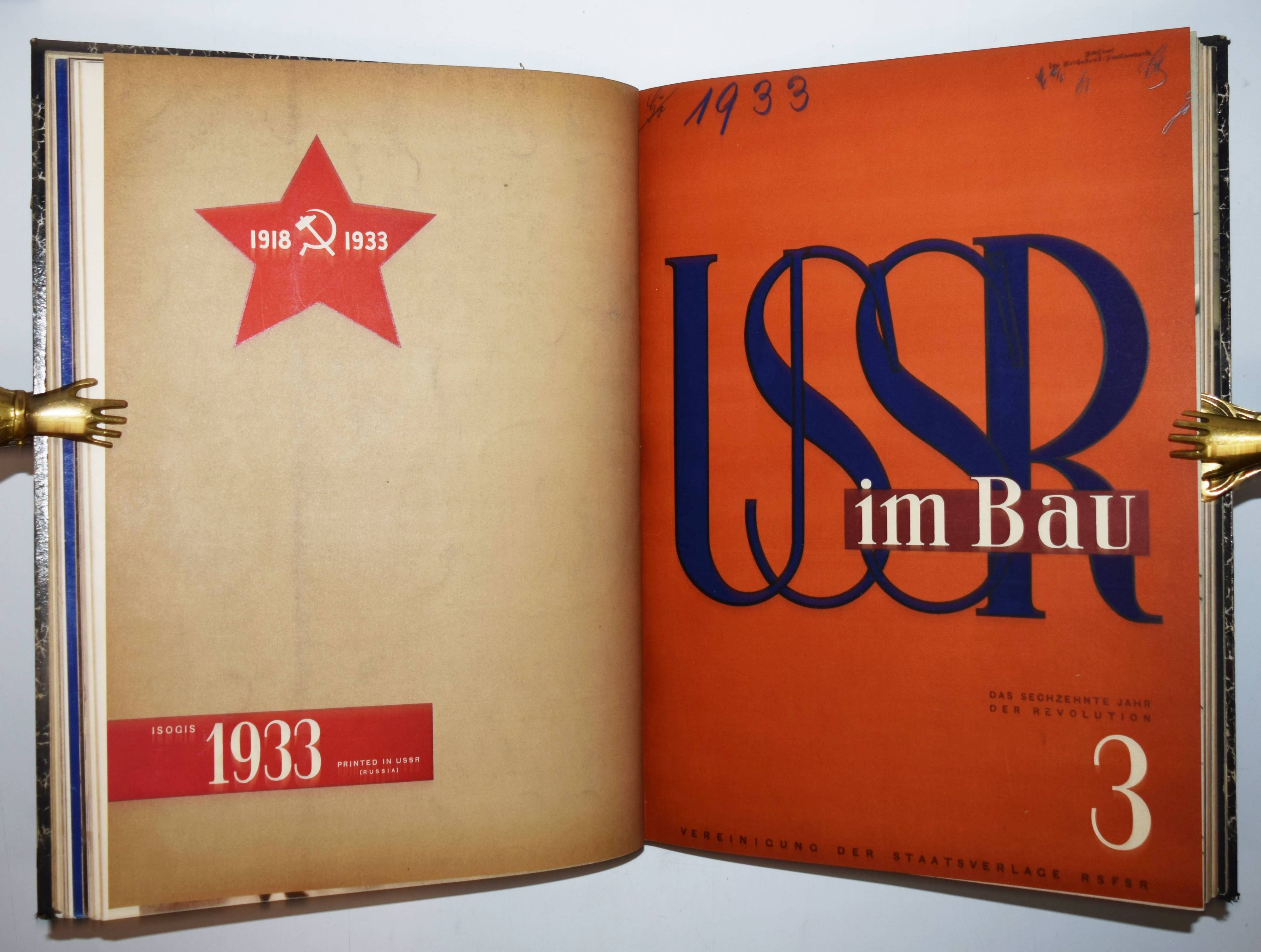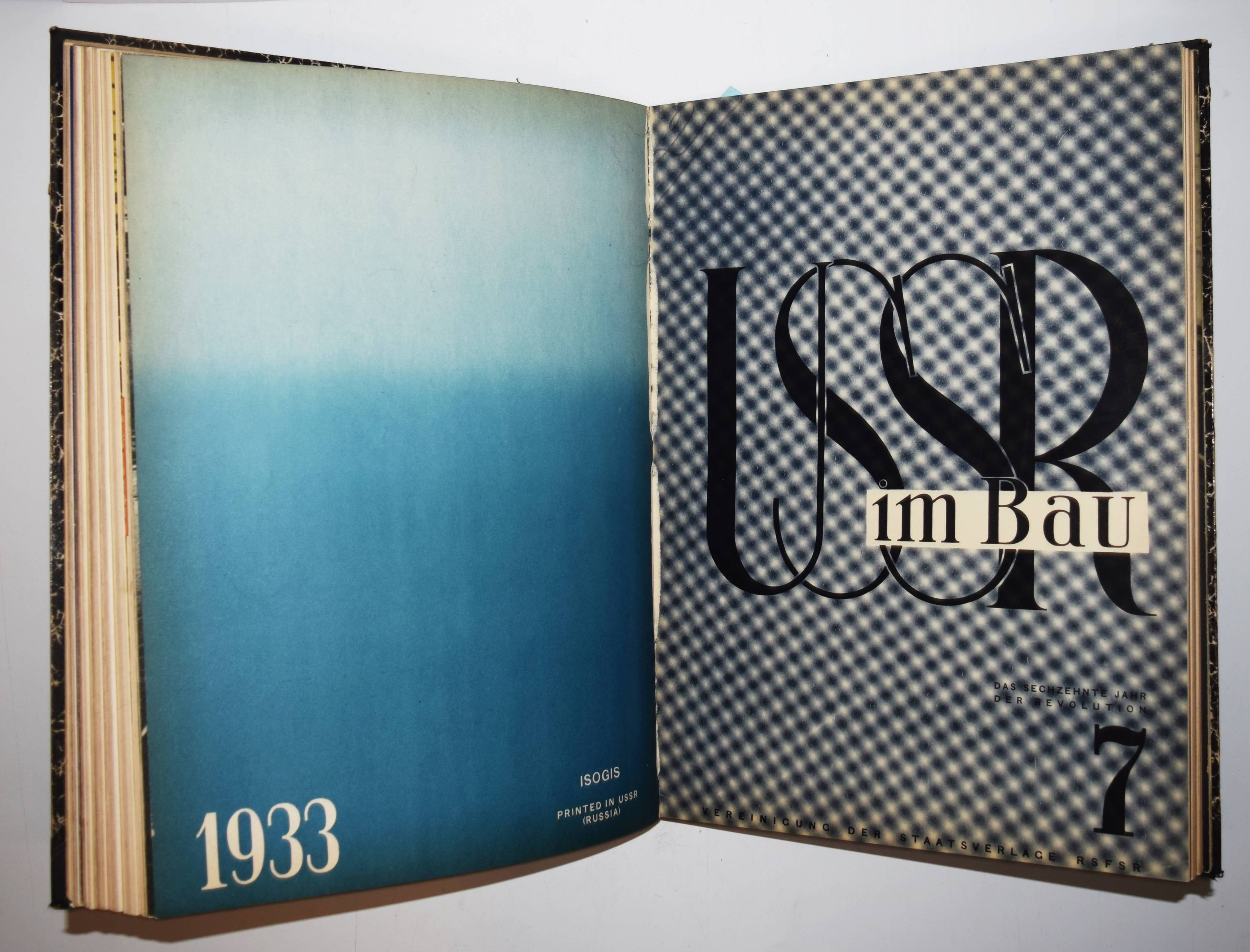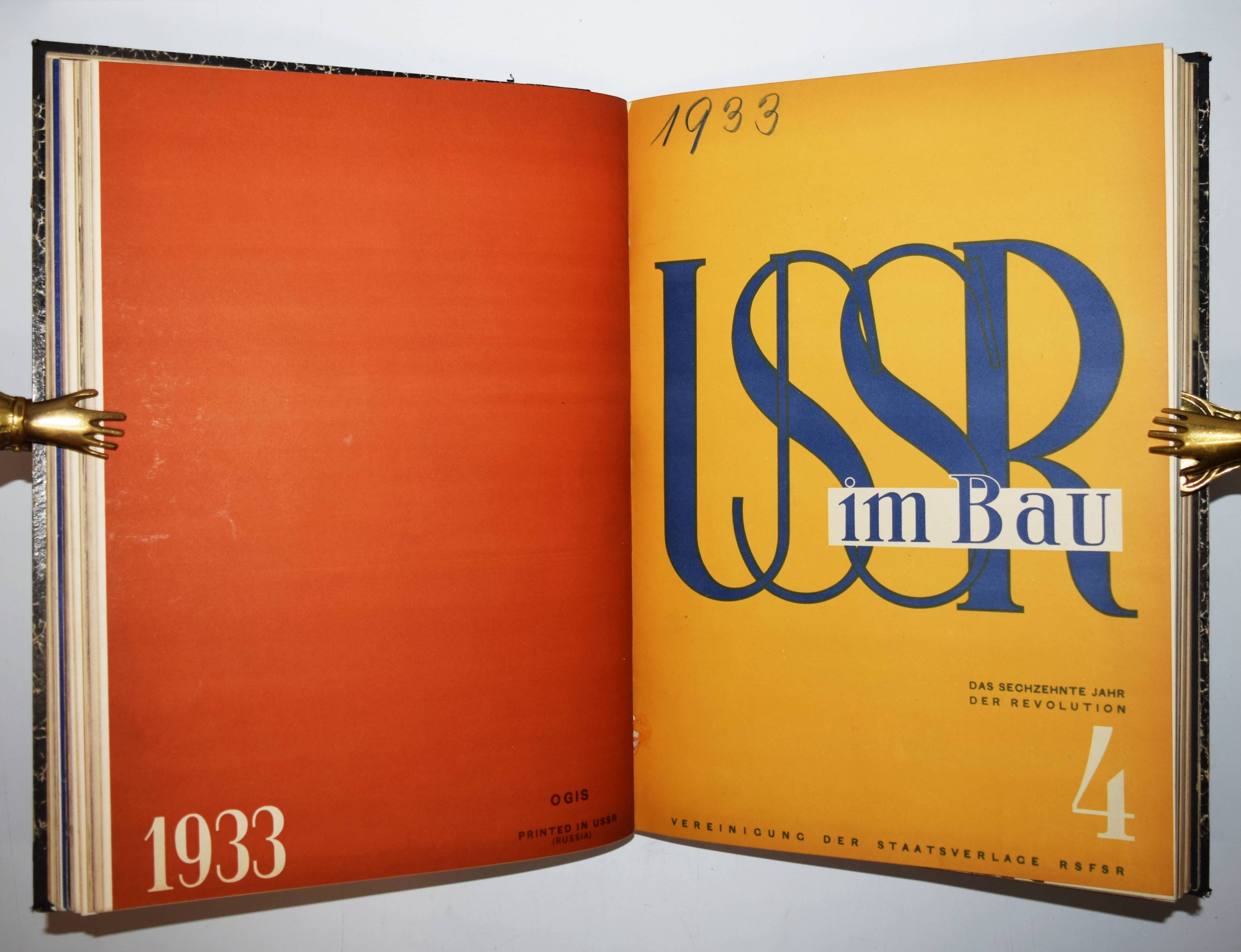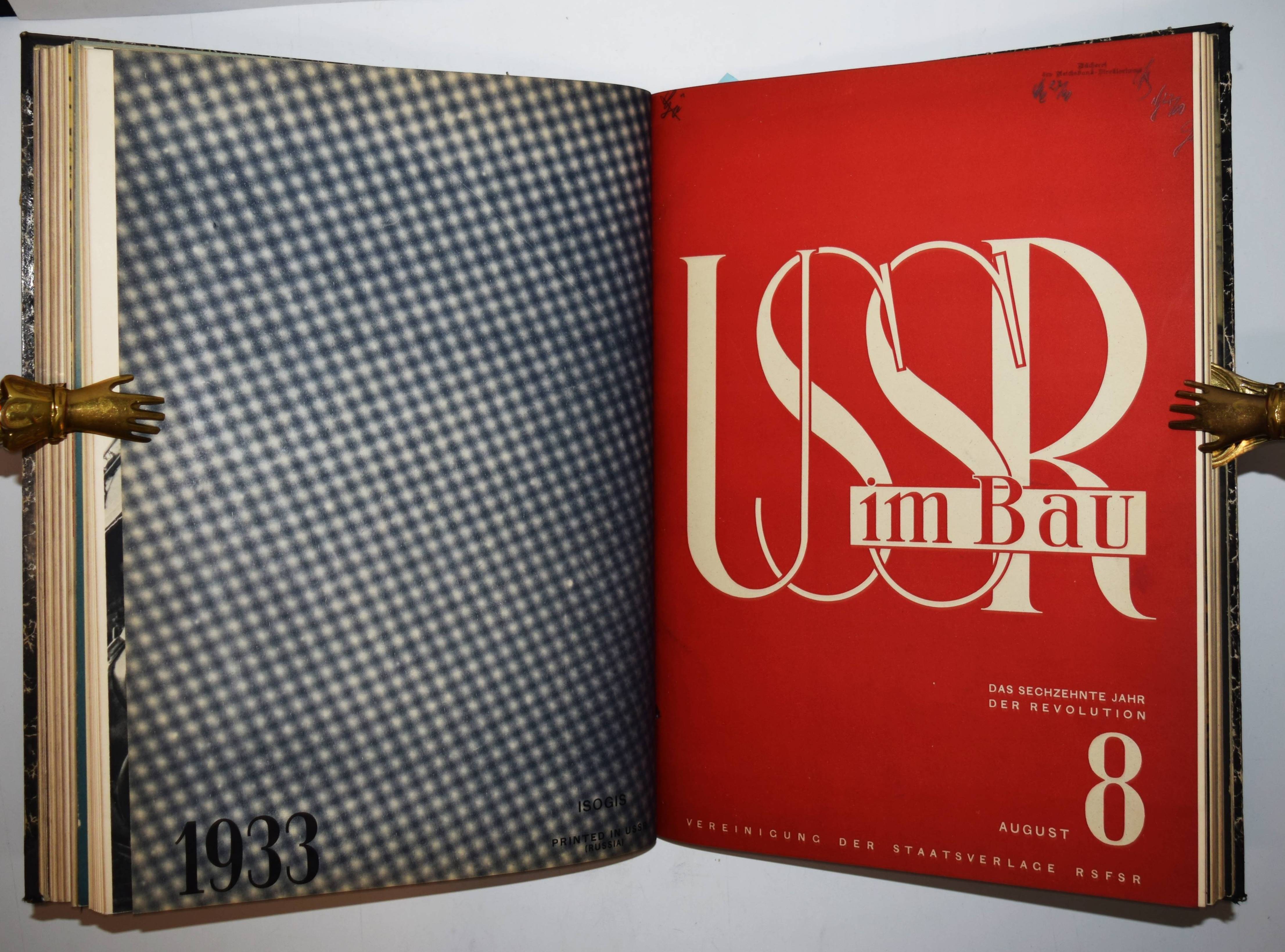 Pjatakov, G(eorgi Leonidowitsch, Editor in Chief). USSR im Bau. Illustrierte Monatsschrift. (Dritter Jahrgang) 1933. 12 Hefte in 1 Band. Moskau, State Publishing House of the RSFSR 1933. Folio (43 x 30 cm.). Mit zahlreichen Abbildungen, teils auf gefalteten Tafeln.. Halbleinenband der Zeit mit goldgepr. Rückenschild (Orig.-Umschläge beigebunden). Hellyer 860. Karasik/Heiting 17 ff. Rowell/Wye 242 f. – Dritter Jahrgang des wichtigsten sowjetischen Propagandamagazins. Mit zwei von El Lissitzky und einer von A. Rodschenko gestalteten Nummern. Die Zeitschrift erschien von 1930 bis 1949 monatlich in fünf Sprachen (Russisch, Englisch, Französisch, Spanisch und Deutsch). Jede Ausgabe war einem anderen Thema gewidmet, beispielsweise Lebensmittel- und Industrieproduktion, der Republik Georgien, dem sowjetischen Kino und Wahlen. – „In the early 1930s photo-reportage became the foundation of the magazine USSR in Construction that „was created as a publication for the popularization of large-scale construction projects by photographic means. But as the magazine grew and developed, the task of ‘popularization’ evolved into that of presenting Socialist reality with dramatic artistry.“ (L. Mezhericher, „Na putiakh k sotsialisticheskomu stiliu fotografii” [“On the way to a Socialist style of photography“], No. 2, p. 14). Well known Soviet designers and photographers worked on USSR in Construction. The industrial spirit of the magazine, expressed in compositionally sharp subjects, panoramas and dynamic shots evokes admiration even today and conveys the atmosphere of enthusiasm that carried along not just the photographers, but also the builders themselves. The creative scale of the construction engendered the photographic epic, a style of monumental artistic photography. The founders of this most successful and high-quality periodical were Gorky and Koltsov“ (Mikhail Karasik). – Umschläge teils etwas berieben, sonst von leichten Gebrauchs- und Altersspuren abgesehen sehr gut erhalten.
