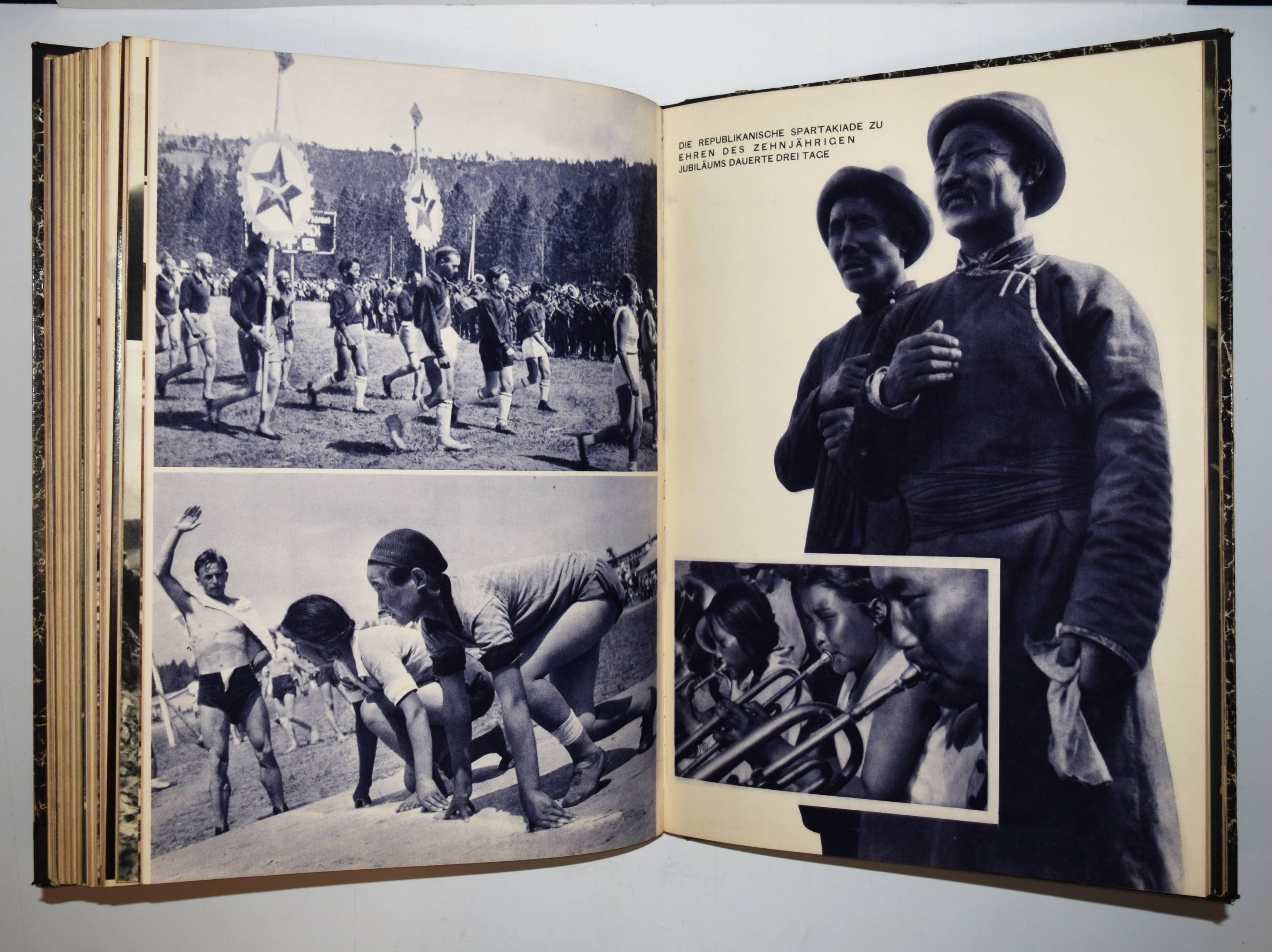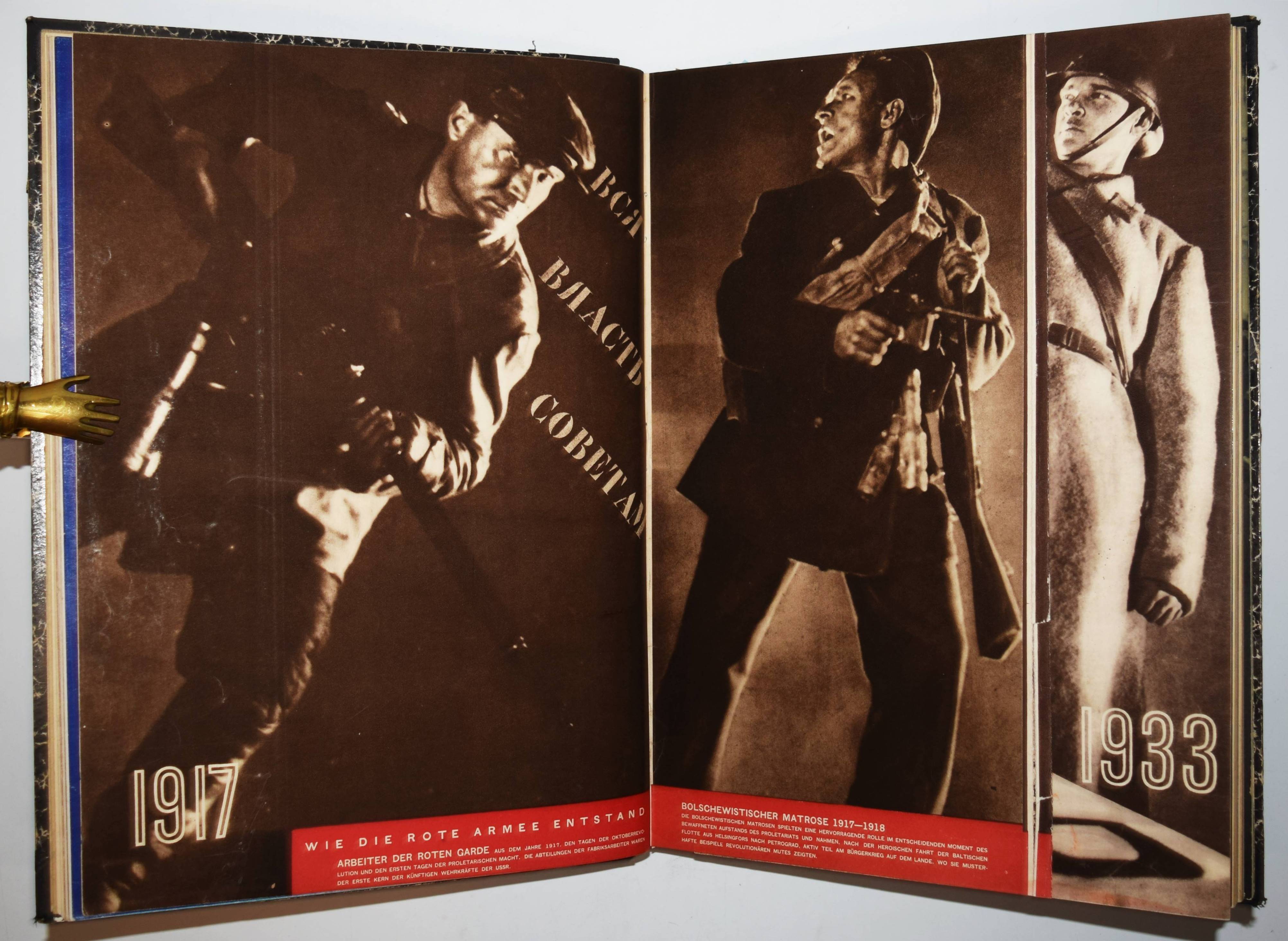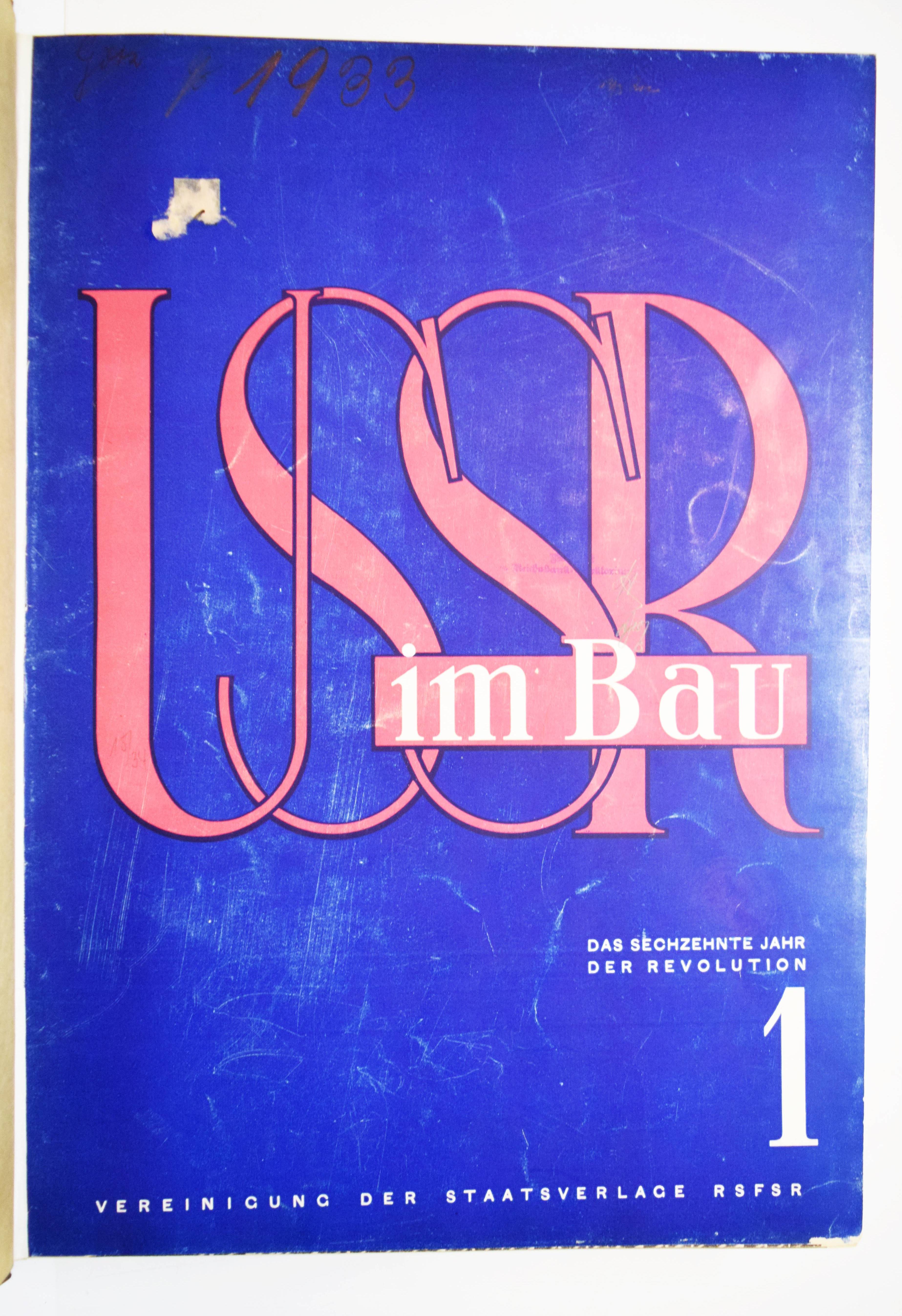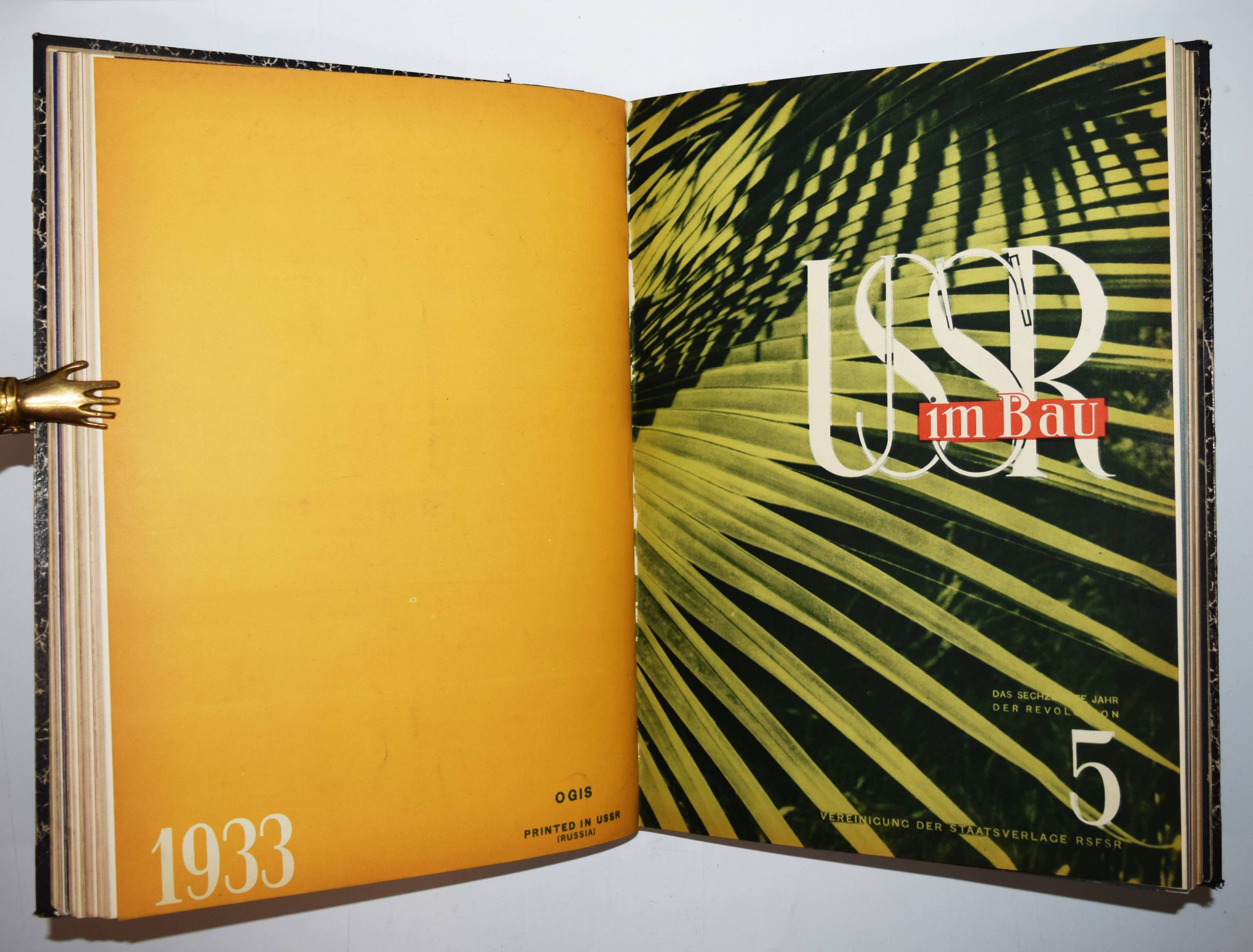 Pjatakov, G(eorgi Leonidowitsch, Editor in Chief). USSR im Bau. Illustrierte Monatsschrift. (Dritter Jahrgang) 1933. 12 Hefte in 1 Band. Moskau, State Publishing House of the RSFSR 1933. Folio (43 x 30 cm.). Mit zahlreichen Abbildungen, teils auf gefalteten Tafeln.. Halbleinenband der Zeit mit goldgepr. Rückenschild (Orig.-Umschläge beigebunden). Hellyer 860. Karasik/Heiting 17 ff. Rowell/Wye 242 f. – Dritter Jahrgang des wichtigsten sowjetischen Propagandamagazins. Mit zwei von El Lissitzky und einer von A. Rodschenko gestalteten Nummern. Die Zeitschrift erschien von 1930 bis 1949 monatlich in fünf Sprachen (Russisch, Englisch, Französisch, Spanisch und Deutsch). Jede Ausgabe war einem anderen Thema gewidmet, beispielsweise Lebensmittel- und Industrieproduktion, der Republik Georgien, dem sowjetischen Kino und Wahlen. – „In the early 1930s photo-reportage became the foundation of the magazine USSR in Construction that „was created as a publication for the popularization of large-scale construction projects by photographic means. But as the magazine grew and developed, the task of ‘popularization’ evolved into that of presenting Socialist reality with dramatic artistry.“ (L. Mezhericher, „Na putiakh k sotsialisticheskomu stiliu fotografii” [“On the way to a Socialist style of photography“], No. 2, p. 14). Well known Soviet designers and photographers worked on USSR in Construction. The industrial spirit of the magazine, expressed in compositionally sharp subjects, panoramas and dynamic shots evokes admiration even today and conveys the atmosphere of enthusiasm that carried along not just the photographers, but also the builders themselves. The creative scale of the construction engendered the photographic epic, a style of monumental artistic photography. The founders of this most successful and high-quality periodical were Gorky and Koltsov“ (Mikhail Karasik). – Umschläge teils etwas berieben, sonst von leichten Gebrauchs- und Altersspuren abgesehen sehr gut erhalten.