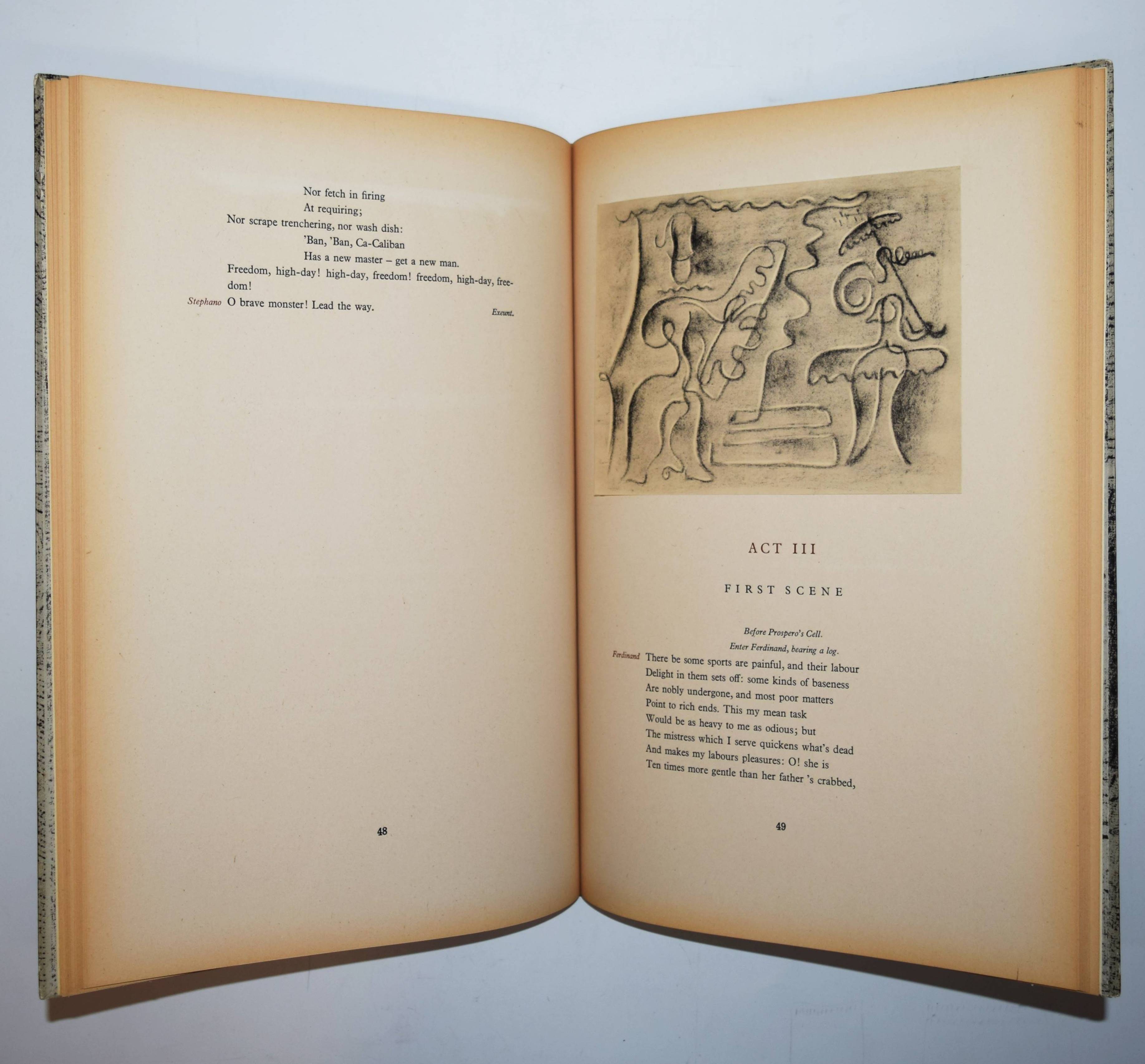 Shakespeare, William. The Tempest. With twenty-nine drawings by Willy Baumeister. Stuttgart, Calw, Gerd Hatje (1946 / 1947). Folio (40 x 28,5 cm.). 85 S., [1] Bl. mit 29 montierten farbigen Abbildungen. Illustr. Orig.-Halbleinenband. Eines von 500 Exemplaren, hier ohne Exemplarnummer und Signatur des Künstlers, aber mit eigenhändiger Zueignung Baumeisters „für Georg Kurt Schauer“. Provenienz: Christian Scheffler, ehemaliger Leiter des Klingspor-Museums, Offenbach, der dieses Buch aus dem Nachlass Schauers erhielt. – „Im März 1946 wurde B. an die Staatliche Akademie der Bildenden Künste Stuttgart berufen. Neben der Professur und zahlreichen Ausstellungen im In- und Ausland (u. a. bei der Biennale in Venedig) entwarf B. auch wieder erfolgreich Bühnenbilder, u. a. für die Stuttgarter Aufführung des Balletts „Liebeszauber“ von Manuel de Falla in Stuttgart (1947), womit er auf dem Cover des Nachrichtenmagazins „Der Spiegel“ abgebildet war“ (C. Mohringer in Frankfurter Personenlexikon). – Der Frankfurter Buchhändler, Verleger, Typograph und Buchhistoriker G. K. Schauer (1899-1984) war zusammen mit Hanns W. Eppelsheimer Gründer der Deutschen Bibliothek in Frankfurt am Main und arbeitete auch beim Aufbau der Frankfurter Zweigstelle des Suhrkamp-Verlags mit, ehe dieser von Berlin nach Frankfurt übersiedelte und sich 1950 vom S. Fischer Verlag abspaltete. – Kanten teils restauriert, gutes sauberes Exemplar mit besonderer Provenienz.