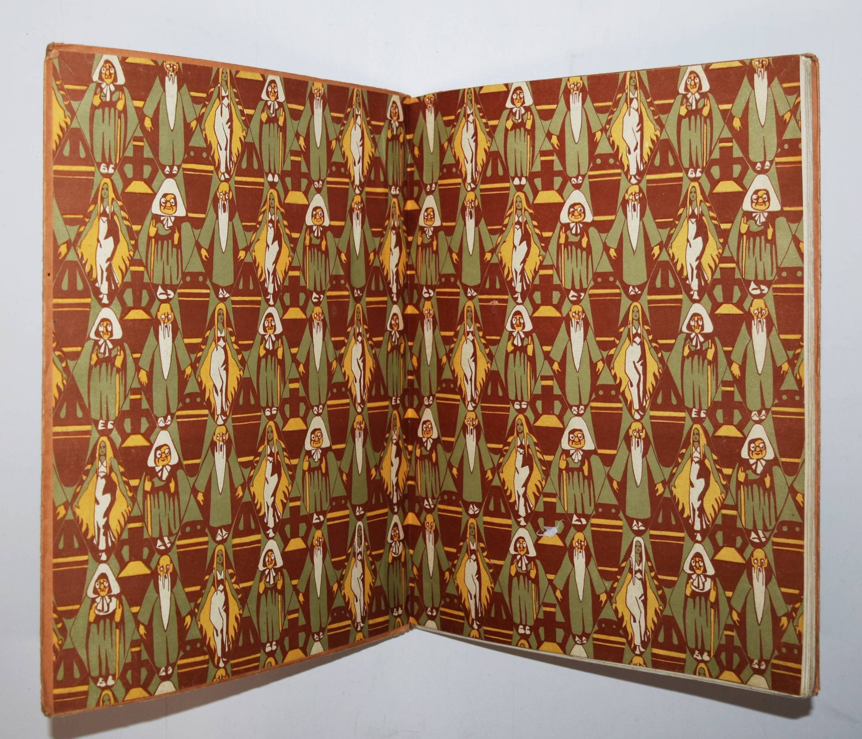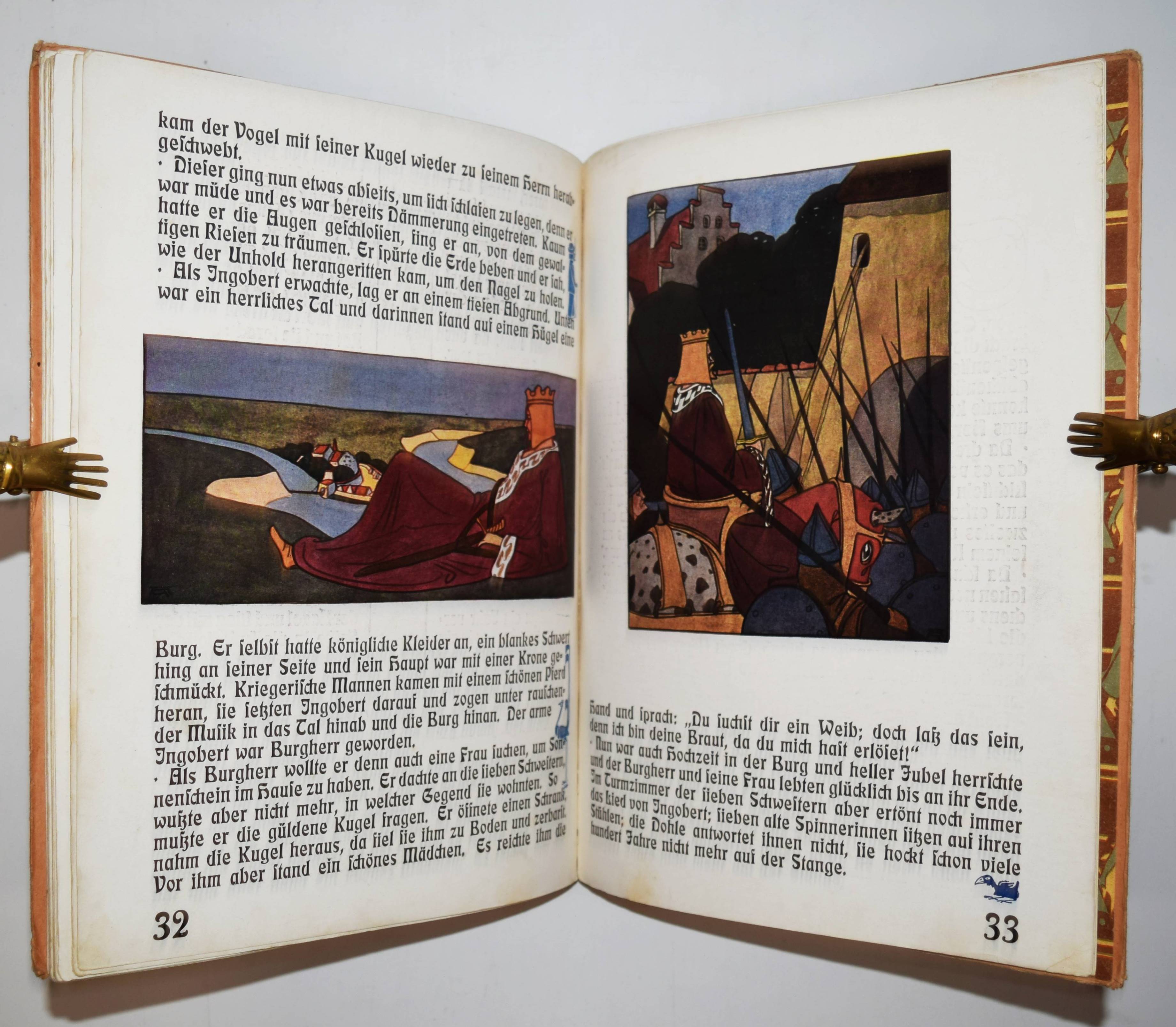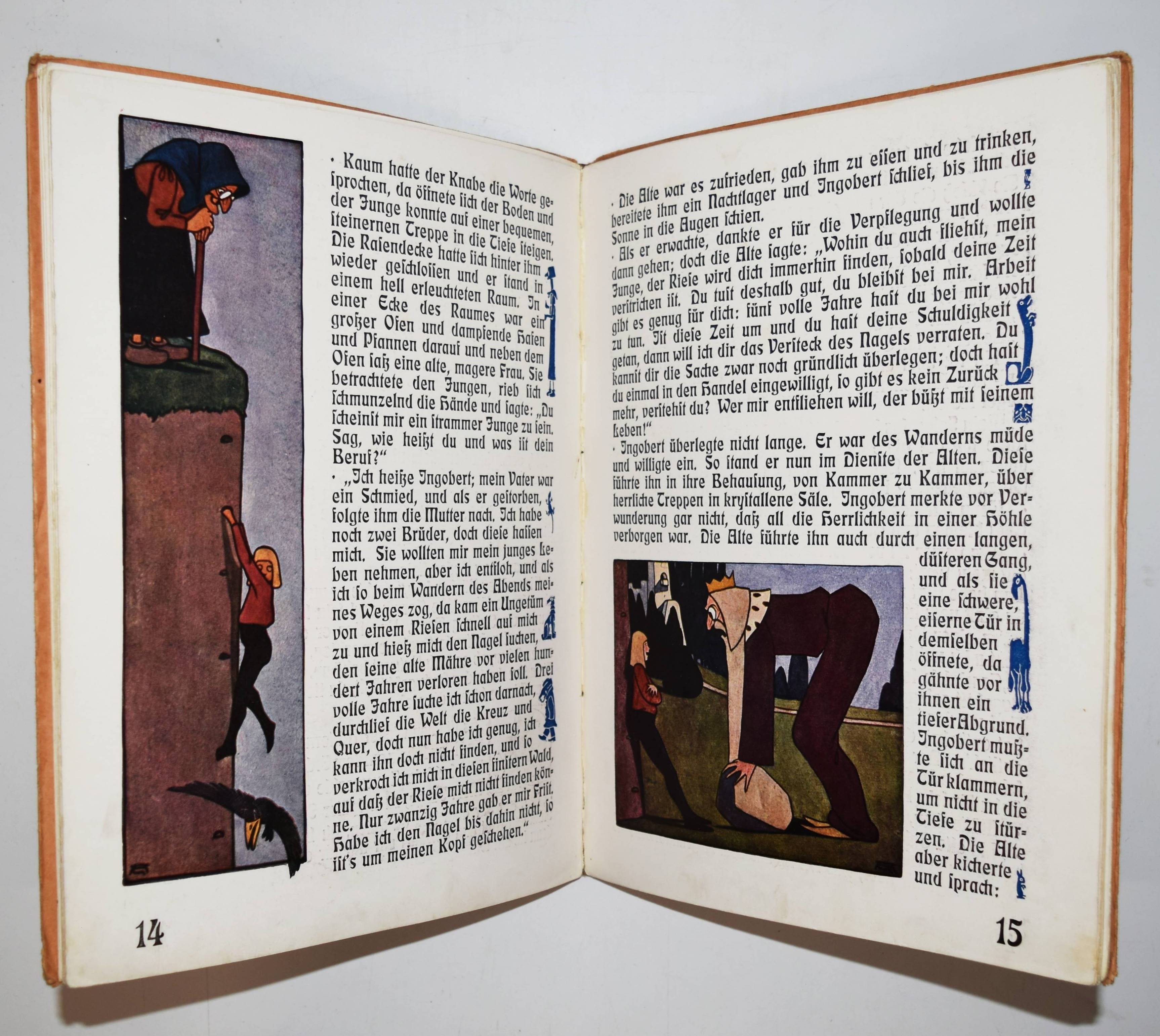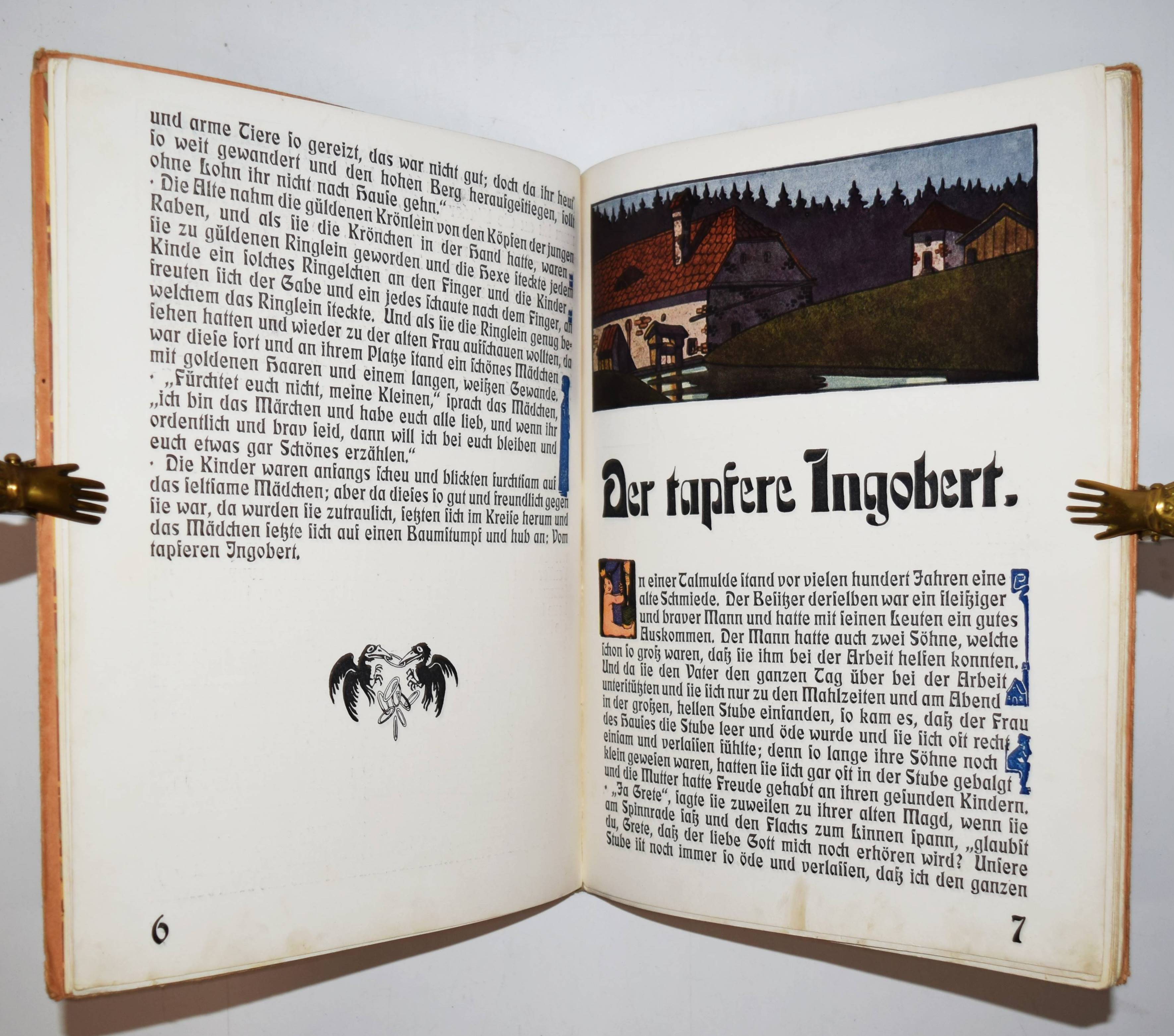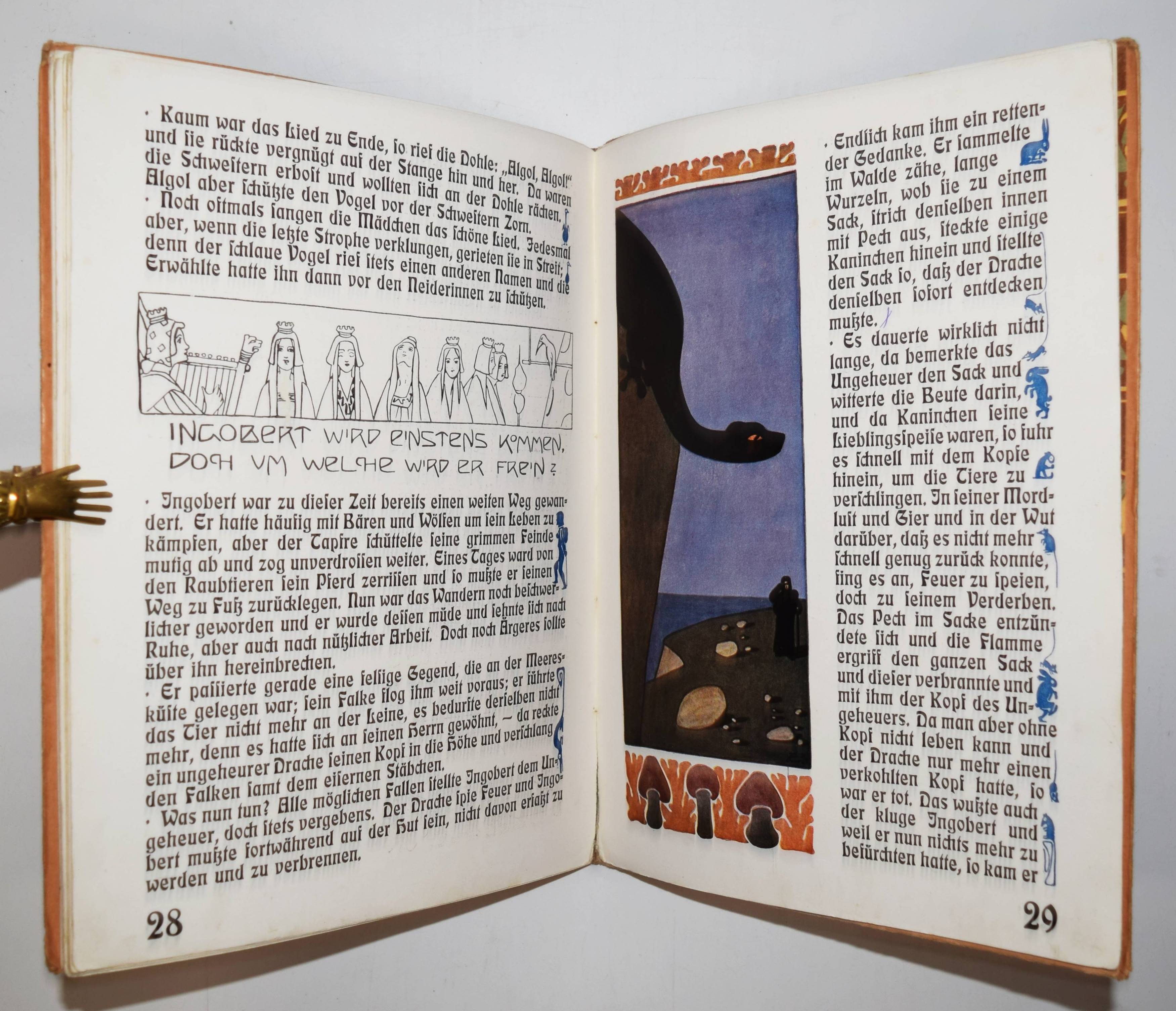 Geigenberger, Aug(ust). Märchen-Buch. (Die Ueberarbeitung und Ergänzung des Textes in der vorliegenden Fassung für die Jugend besorgte Alphons Krämer-Kempten). Kempten, München, Jos(eph) Kösel o. J. (1910). Gr.-4° (32 x 24,5 cm.). 35 S. mit farbigen Illustrationen und Buchschmuck von A. Geigenberger. Typogr. Orig.-Pappband. Bilderwelt 528. Ries 546, 2. Stuck Villa I, 357 und II, 192. – Erste und einzige Ausgabe des hervorragend typographisch gestalteten Jugendstil-Bilderbuchs. – „Trotz vorzüglicher neuer Schriftentwürfe blieb es für den illustrierenden Künstler um 1900 ein Anliegen, der Verwandtschaft von Bild und Text durch eine individuelle und flexible handschriftliche Gestaltung anstelle der Drucktype Rechnung zu tragen. August Geigenberger (1875-1909) belebt bei desem Verfahren die Ränder mit zeilenfüllenden Grotesken“ (Hans Ries in Bilderwelt). – Einband angestaubt und leicht fleckig, Rücken unauffällig restauriert, im Blattrand teils etwas fingerfleckig, sonst gut erhalten.