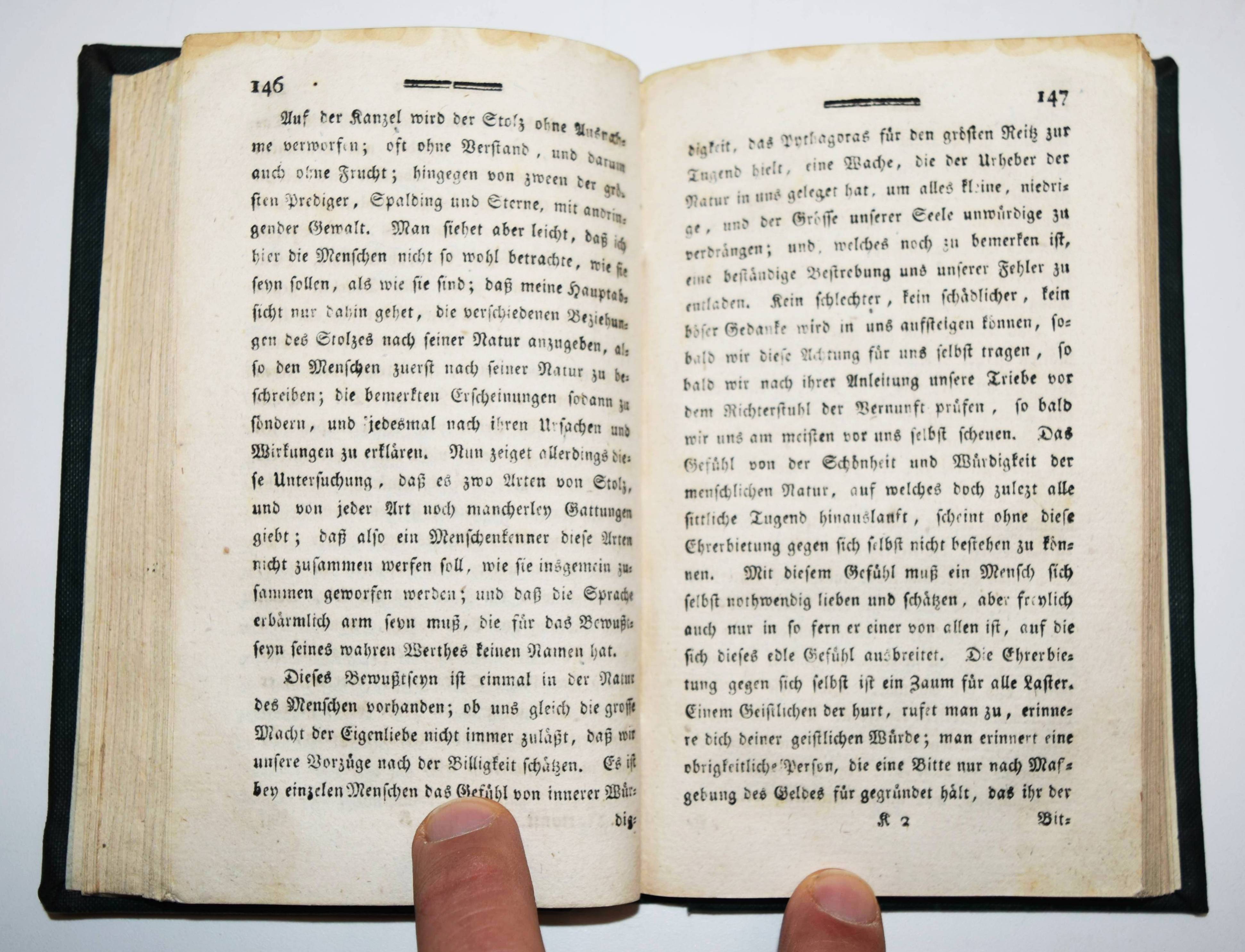 Zimmermann, J(ohann) G(eorg). Vom Nationalstolze. Karlsruhe, Christian Gottlieb Schmieder 1783. [2] Bl., 272 S. mit Titelvignette in Holzschnitt. Leinenband des 20. Jahrhunderts mit goldgepr. Rückenschild. (Sammlung der besten deutschen prosaischen Schriftsteller und Dichter, Band 130). VD18 10611584. – Karlsruher Nachdruck des bedeutenden Werks des Schweizer Aufklärers und Philosophen J. G. v. Zimmermann (1728-1795). – Ohne den Reihentitel, vereinzelt leicht stockfl., gutes Exemplar.