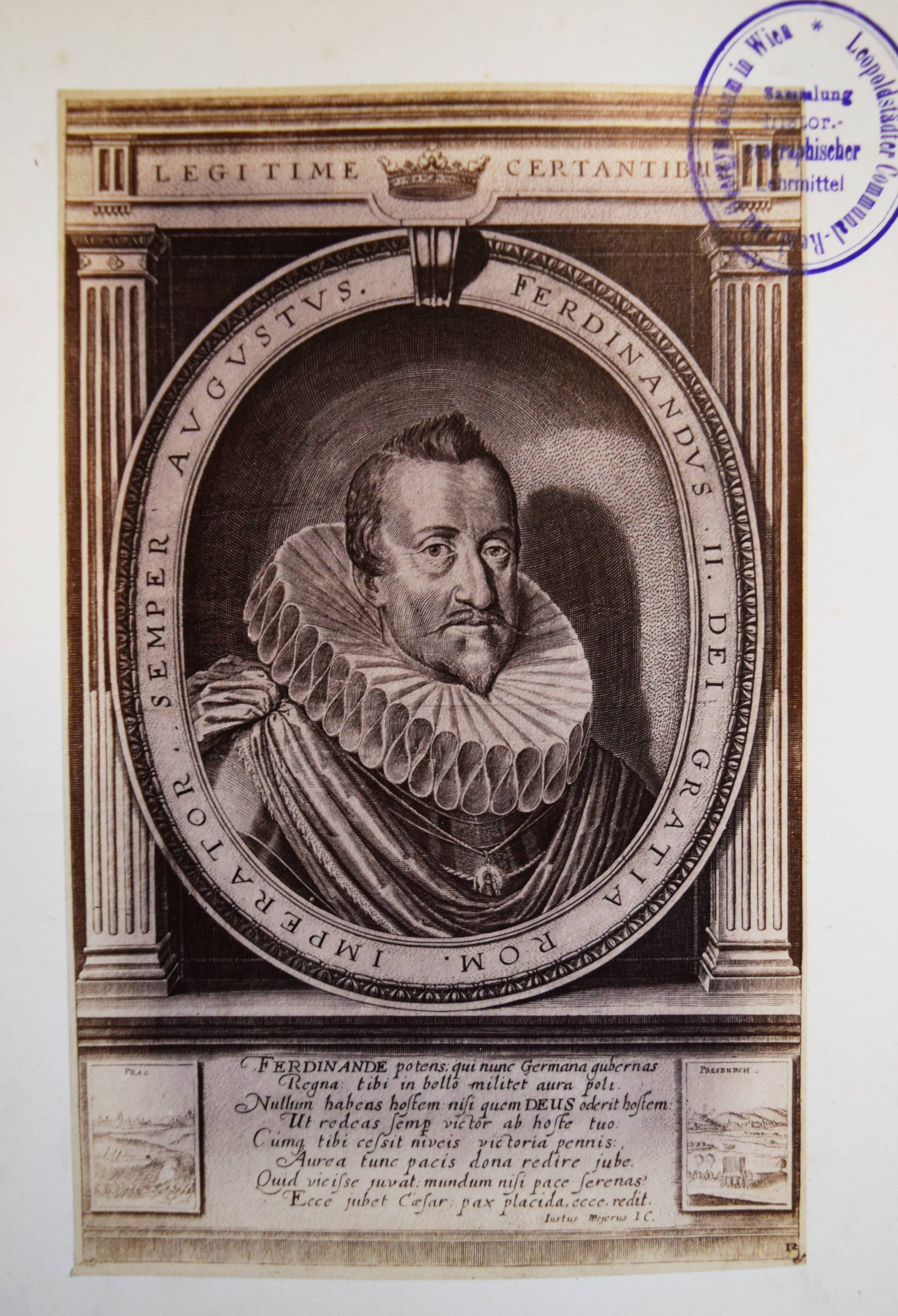 Precechtel, (Josef) Rupert (Maria). Bildnissreihe sämmtlicher Kaiser aus dem allerdurchlauchtigsten Hause Habsburg und Lothringen von Rudolf I. bis auf die gegenwärtige Zeit. Nach den besten Originalien. – Pinacotheca Caesarum Augustissimae Domus Habsburgo-Lothringicae. – Série des portraits de tous les empereurs de l’auguste maison Habsbourg-Lorraine. Wien, Selbstverlag, Druck von Hugo Hoffmann 1876. Gr.-8° (23 x 19 cm.). [7] Bl. und 25 montierte Orig.-Photographien (Albuminabzüge, 17 x 10,5 cm.) auf dünnem Trägerkarton. Orig.-Leinenband mit goldgepr. Rücken- und Deckeltitel, Deckel-Filetten und Goldschnitt. Wurzbach XXIII, 232. Nicht bei Heidtmann, Wie das Photo ins Buch kam und anderen Foto-Bibliographien. – Erste Ausgabe. – Sehr seltene Genalogie der Habsburger; die vorliegende erste Ausgabe mit den fotografischen Portraits ist nur in vier Bibliotheken in Bayern und in Wien nachweisbar (lt. KVK). 1879 erschien eine zweite Ausgabe mit lithographierten Portraits. – Der Priester, Historiker und Zeichner J. R. M. Precechtel (1821 – 1897) schreibt im Vorwort: „Es kann einem jeden Sackenner einleuchtend sein, dass ich mit dem Herausgeben der photographischen Bildnisse cler allerdurchlauchtigsten Habsburger-Dynastie ein sehr schwieriges Werk unternommen habe, indem wir aus dem XIII., XIV. und XV. Jahrhunderte wenig Quellen besitzen, aus denen aus denen auf die Echtheit der Bildnisse geschlossen werden könnte, doch dürfen wir diejenigen Quellen, die wir haben, nicht absolut verwerfen. Selbst Dr. Ern. Birk sagt in seinen Berichten und Mittheilungen des Alterthum-Vereines zu Wien, Band I. 1856 pag. 95: dass eine ″ neue vollständige Ausgabe der Monumenta des allerhöchsten Kaiserhauses (″Monumenta Aug. Domus Austriacae, Viennae A. MDCCL.“) mit Anwendung aller vervollkommnten technischen Hilfsmittel der Gegenwart wohl noch lange ein frommer Wunsch bleiben dürfte.“ Zu meinem äusserst schwierigen Unternehmen gesellte sich noch der erschwerende Umstand, dass ich aus der k. k. Hof- und Fideicommiss-Bibliothek vermöge eines Gesetzes Porträte zu leihen nicht bekommen konnte und dieselben in den Antiquariaten schon äusserst spärlich sind. Doch forschte und sammelte ich in den Privat Bibliotheken ohne Rast, und mit grosser Mühe gelang es mir, soviel es möglic h war, die ältesten und besten Porträte des allerdurchlauchtigsten Kaiserhauses zu sammeln, chronologisch zu ordnen und im photographischen Wege ein Werk herauszugeben, wie es bisher nicht existirt.“ – Titelblatt, die Seiden-Hemdchen und 15 Fotos in einer Ecke mit dem Stempel einer Wiener Schul-Bibliothek, sonst sehr gut erhalten.