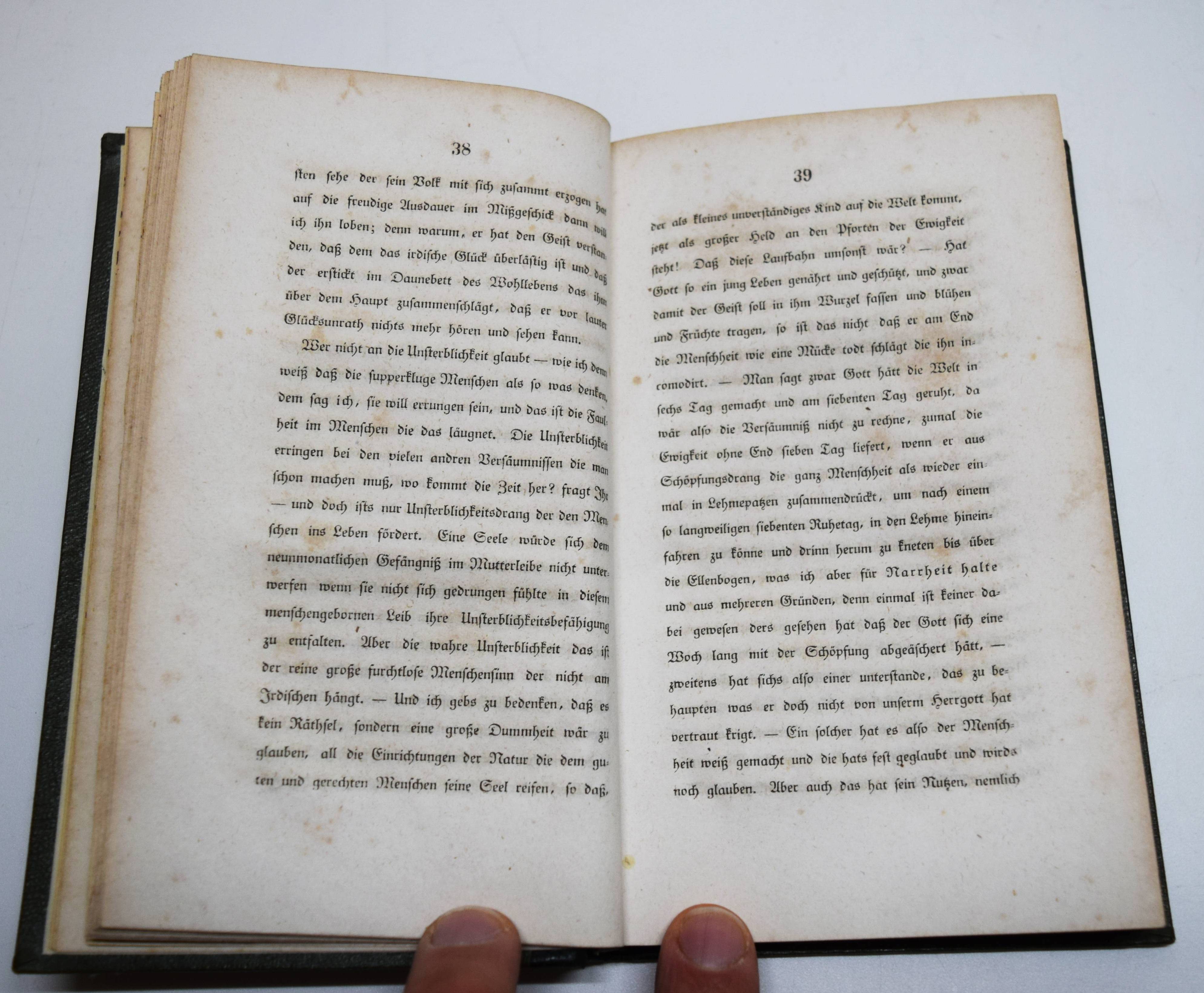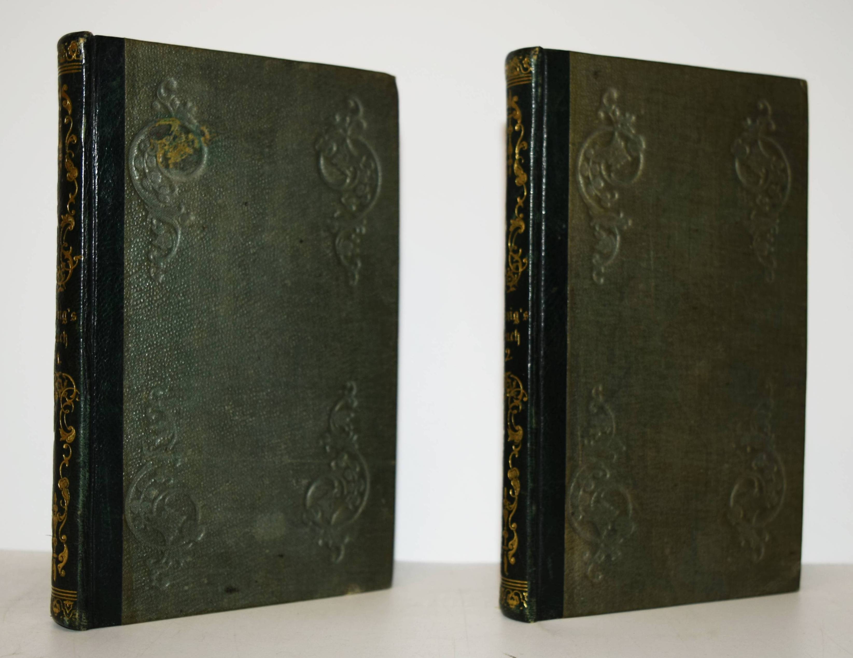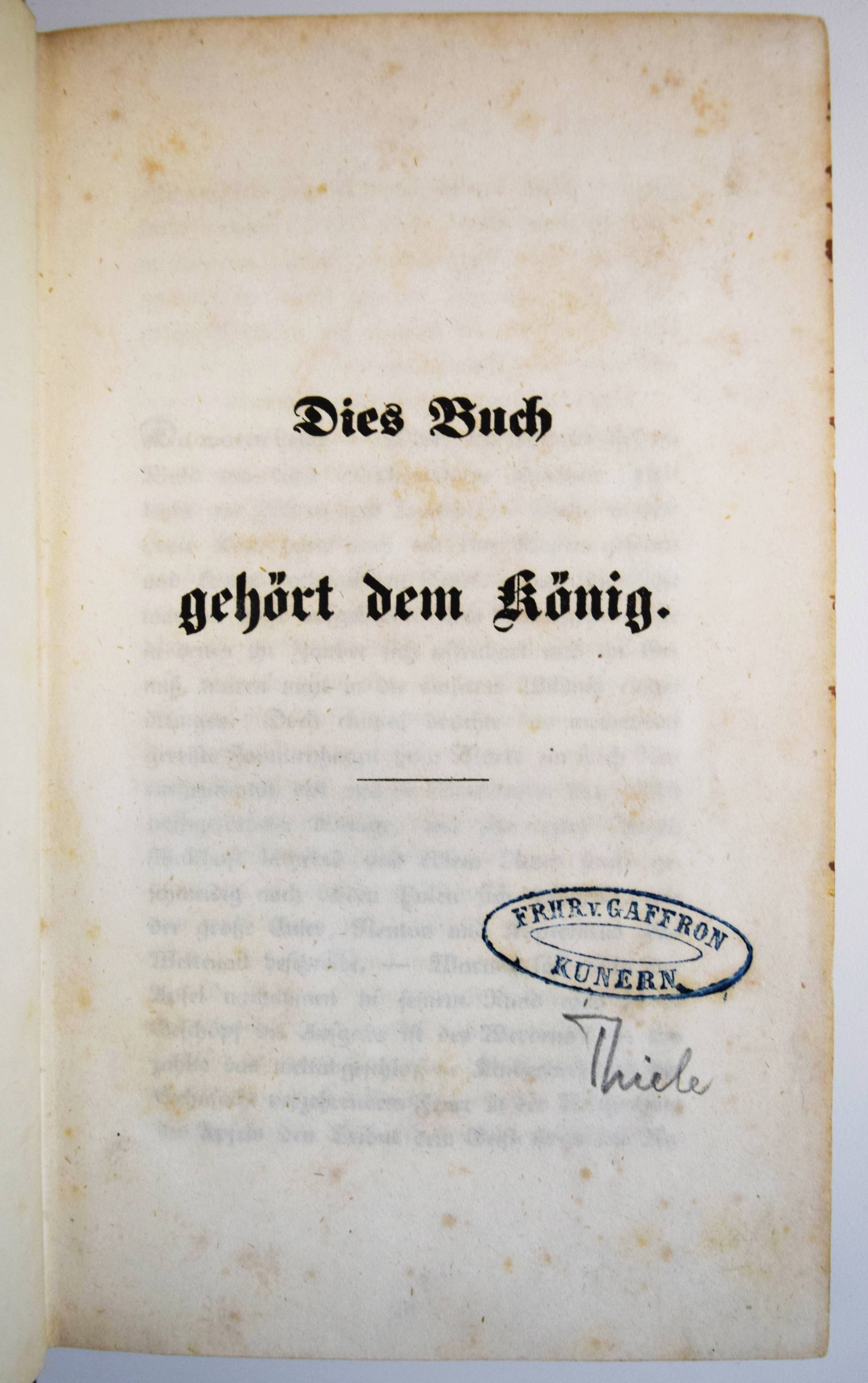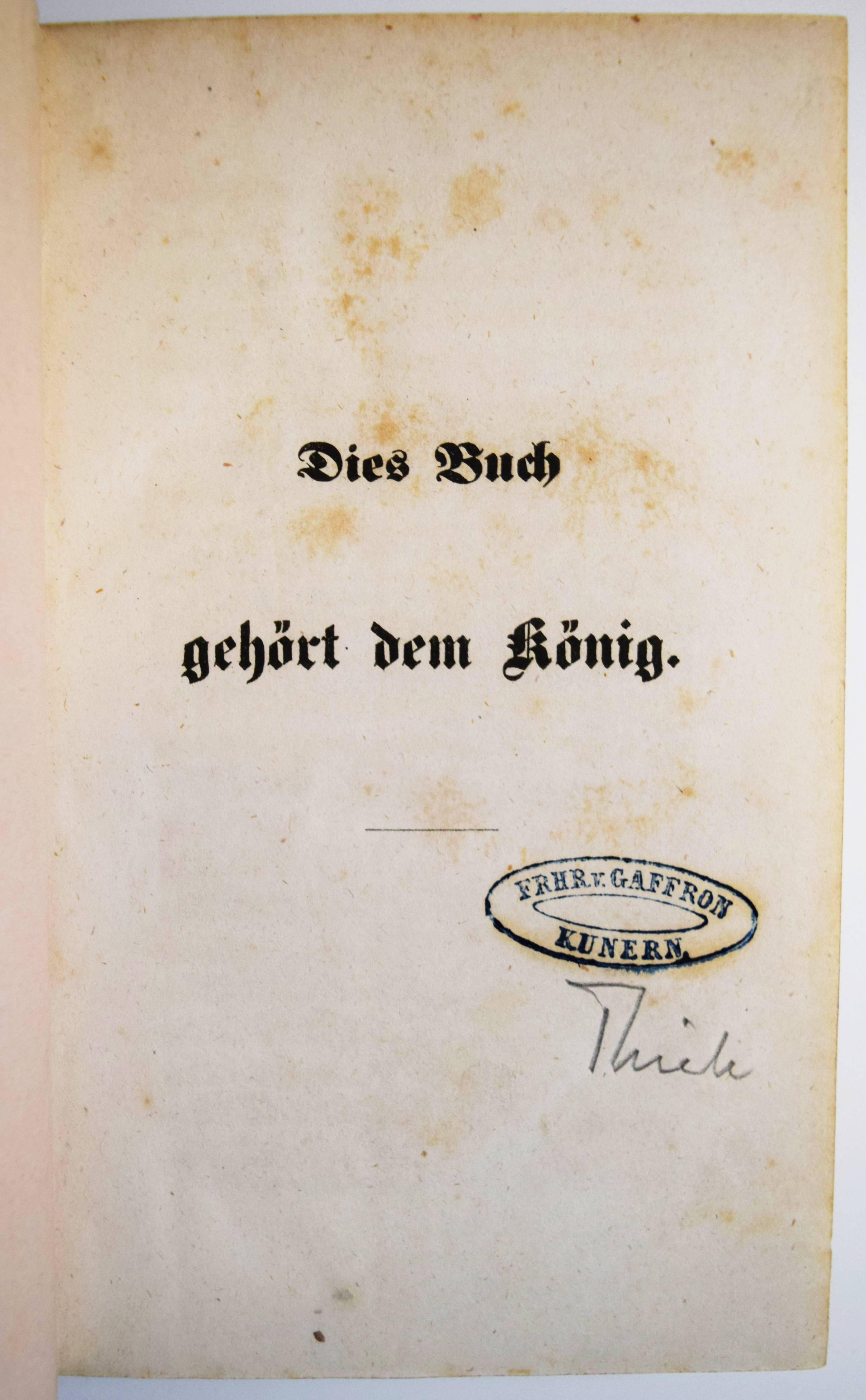 (Arnim, Bettina v.). Dies Buch gehört dem König. 2 Bände. (Berlin, Eduard Heinrich Schroeder 1843). Kl.-8° (17,5 x 11 cm.). VIII, 307, (1) S.; [1] Bl., S. 308-598. Dunkelgrüne Halblederbände der Zeit mit goldgepr. Rückentiteln, Romantikervergoldung und blindgepr. Deckel-Ornamentik.. Slg. Borst 2055. Goedeke VI, 85, 7. Houben, Verbotene Bücher I, 33 ff. Mallon 149, 48. Pataky I, 18. – Erste Ausgabe der ersten „Sozialreportage der deutschen Literatur“. Bettine von Arnim fordert dem Zeitgeist entsprechende gesellschaftliche Freiheiten. – „Das 1843 erschienene fiktive Gespräch mit der Mutter Goethes soll angeblich 1807 stattgefunden haben. Die Autorin schildert zwei Besuche der „Frau Rat“ bei der Königin Luise im Darmstädter Schloss in den Jahren 1799 und 1803, die sie zu einer Begegnung zusammenfasst, um die Erzählung lebendiger zu gestalten. In die Schilderungen kleinbürgerlichen und höfischen Lebens – etwa der Beschreibung eines Hofballs – lässt sie ihre politischen, sozialen und philosophischen Vorstellungen und Ideen einfließen. Ihre Theorien über den Begriff der Freiheit, die sich gegen eine verhärtete Moral, gegen Pädagogen und Pietisten sowie gegen das konfessionell gebundene – und ausgeartete – Christentum wenden, sind von der Aufklärung geprägt. Bettina wehrt sich jedoch dagegen, als Anhängerin des Atheismus zu gelten, und bekennt sich zu einem etwas unbestimmten Deismus. Wahre Unsterblichkeit billigt sie nur den Hervorbringungen der menschlichen Intelligenz zu, die an nichts Irdisches gebunden ist“ (KLL). – „Der Geist der Schönheit in der Form wird im Menschengeist zum Propheten. Der Geist in dem die reine Form der Individualität liegt der ist gesund. Freiheit allein bringt Geist, Geist allein bringt Freiheit.“ (Aussprüche der Frau Rat, S. 3). – Stellenweise etwas braunfleckig, wie meist ohne die beiden Haupttitel mit der Verlagsangabe, sehr gutes dekorativ gebundenes Exemplar aus der Schloß-Bibliothek des preussischen Generals und Politikers Ernst Maximilian Hermann von Gaffron-Oberstradam (seit 1840 Freiherr von Gaffron-Kunern, 1797-1870) mit dessen Exlibris-Stempel auf den Nebentiteln.