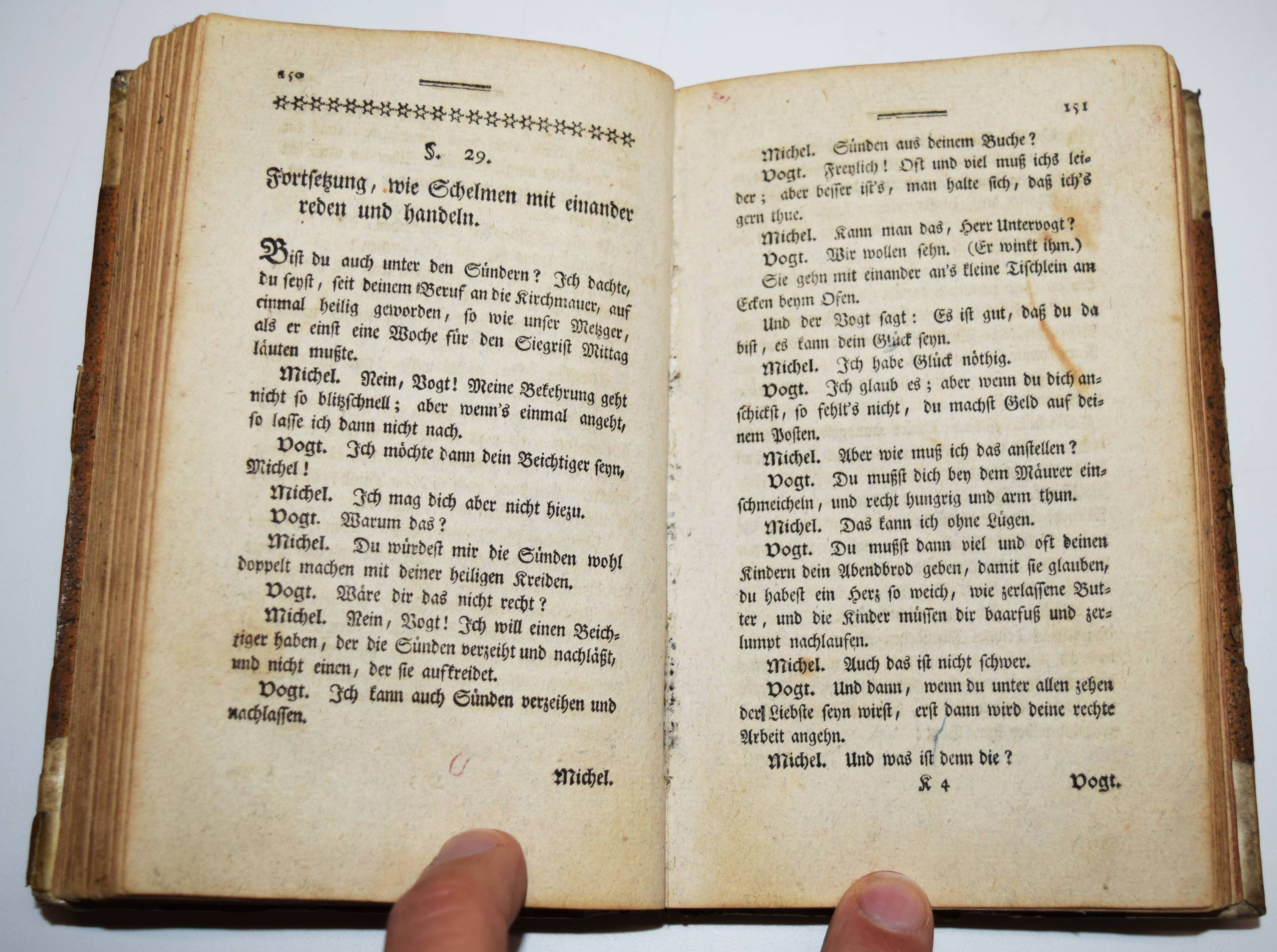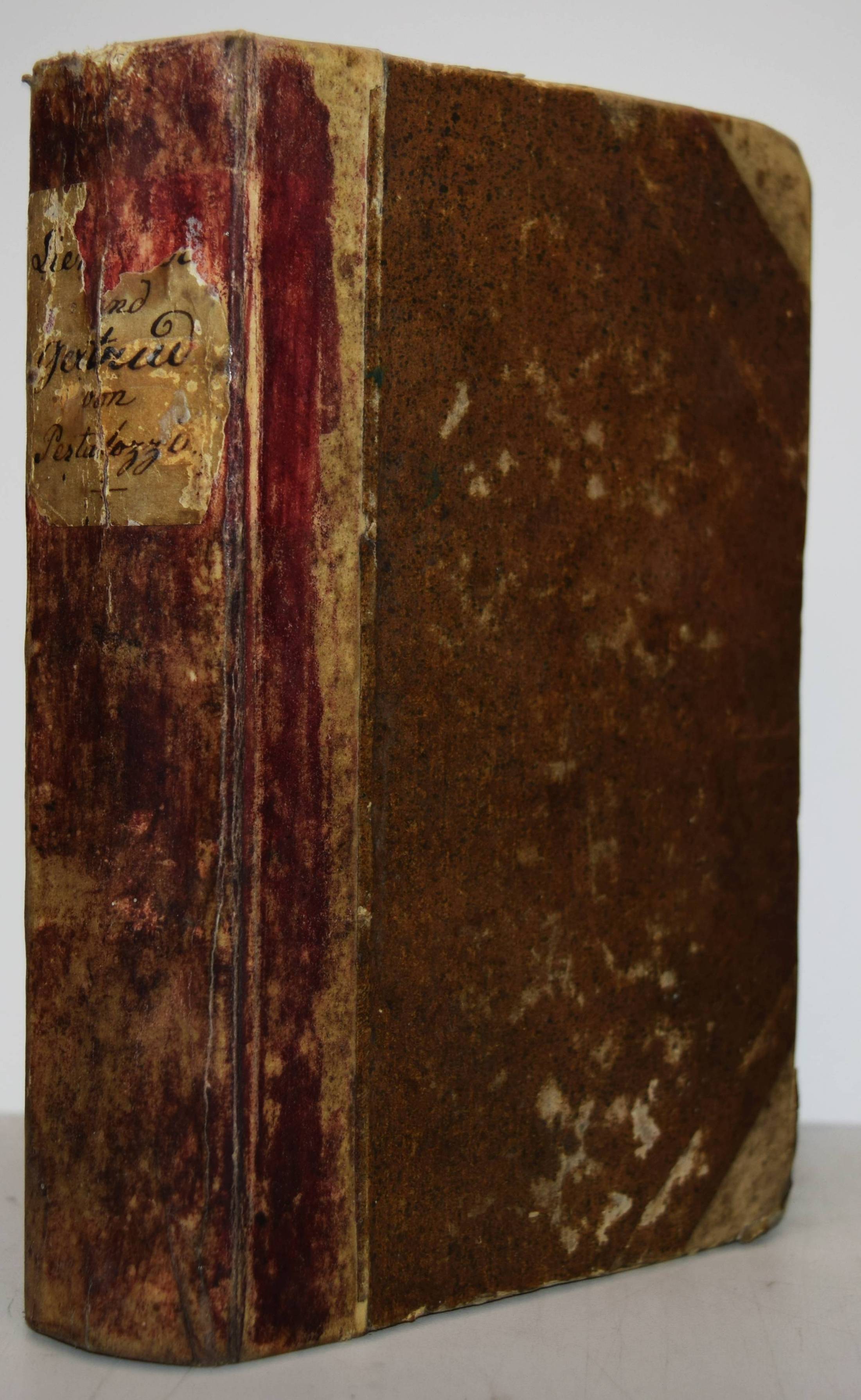 (Pestalozzi, Johann Heinrich). Lienhard und Gertrud. Ein Buch für das Volk. Erster Teil (von 4). Berlin und Leipzig, George Jakob Decker 1781. Kl.-8° (17 x 10,5 cm.). [8] Bl., 379 S. mit gestoch. Titelvignette von Daniel Chodowiecki und 1 gefalteten Musik-Beilage. Pappband der Zeit mit handschr. Rückenschild. Slg. Borst 425. Engelmann, Chodowiecki 381. Goedeke XII, 62,1a. Israel, Pestalozzi I, 43, 7. Rümann 848. VD18 11214422. – Seltene erste Ausgabe des ersten Teils von Pestalozzis Hauptwerk, „einer Art Erziehungsroman“. Der letzte Band (4) erschien erst 1784. – Pestalozzi berichtet über die Entstehung des Werks in einem Brief an Battier: „Ich fing bei der Hütte einer gedrückten Frau und mit dem Bild der größten Zerrüttung des Dorfes an und endete mit seiner Ordnung“ (Israel S. 50). Diese Frau wird Ausgangspunkt und Vorbild für die allgemeine Volkserziehung, also auch für die „Schule des Volkes“, die das den Kindern ersetzen soll, was sie von ihren Eltern nicht bekommen, aber doch so unumgänglich nötig haben. Pestalozzi „hat seine Erziehungsromane auch ‚Volksbücher‘ genannt. Sie sollten breiten Kreisen des Volkes die Grundlagen seines Denkens nahebringen. Er dachte dabei vor allem an bäuerliche Leser und daran, dass die Details der Geschichten mit dem ganzen Reiz auf Kinder wirken könnten. J. H. Campe übernahm Teile aus Lienhard und Gertrud in seine Kinderbibliothek“ (Bertlein in LKJ III, 21). Die Musikbeilage enthält das von Keißer vertonte Gedicht Goethes „Der du von dem Himmel bist“. – Einband stärker berieben, stellenweise etwas braunfleckig, sonst gut erhalten.