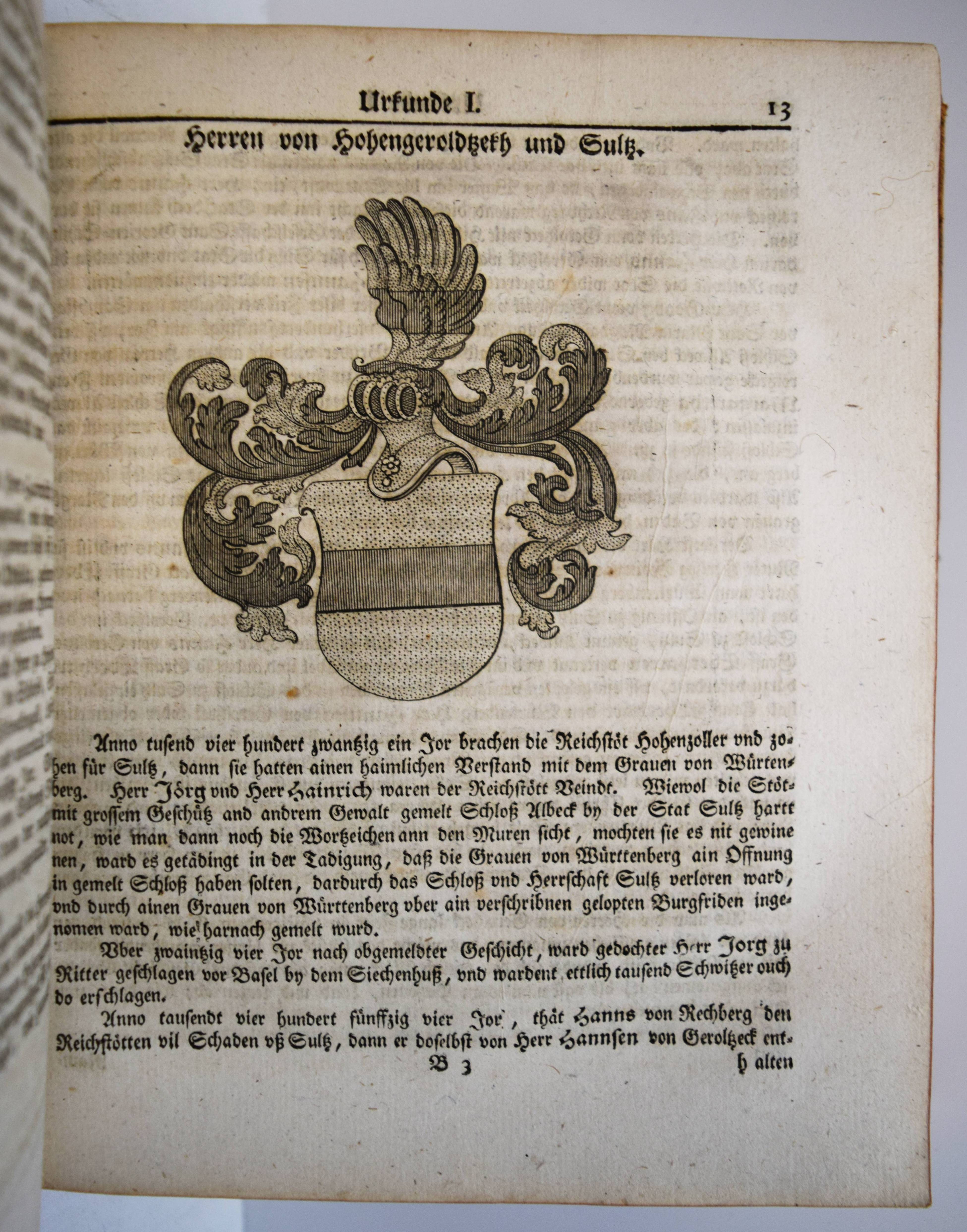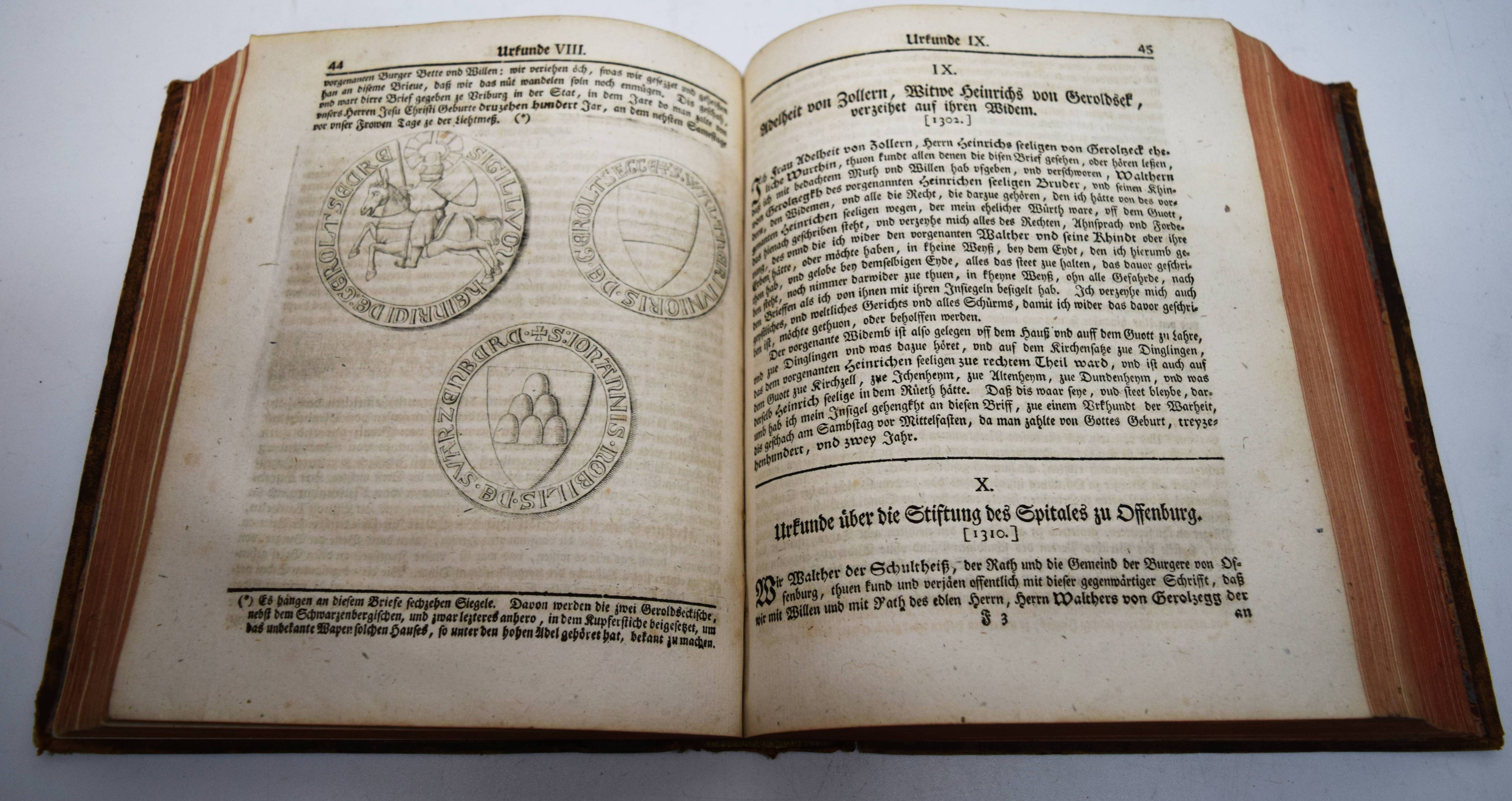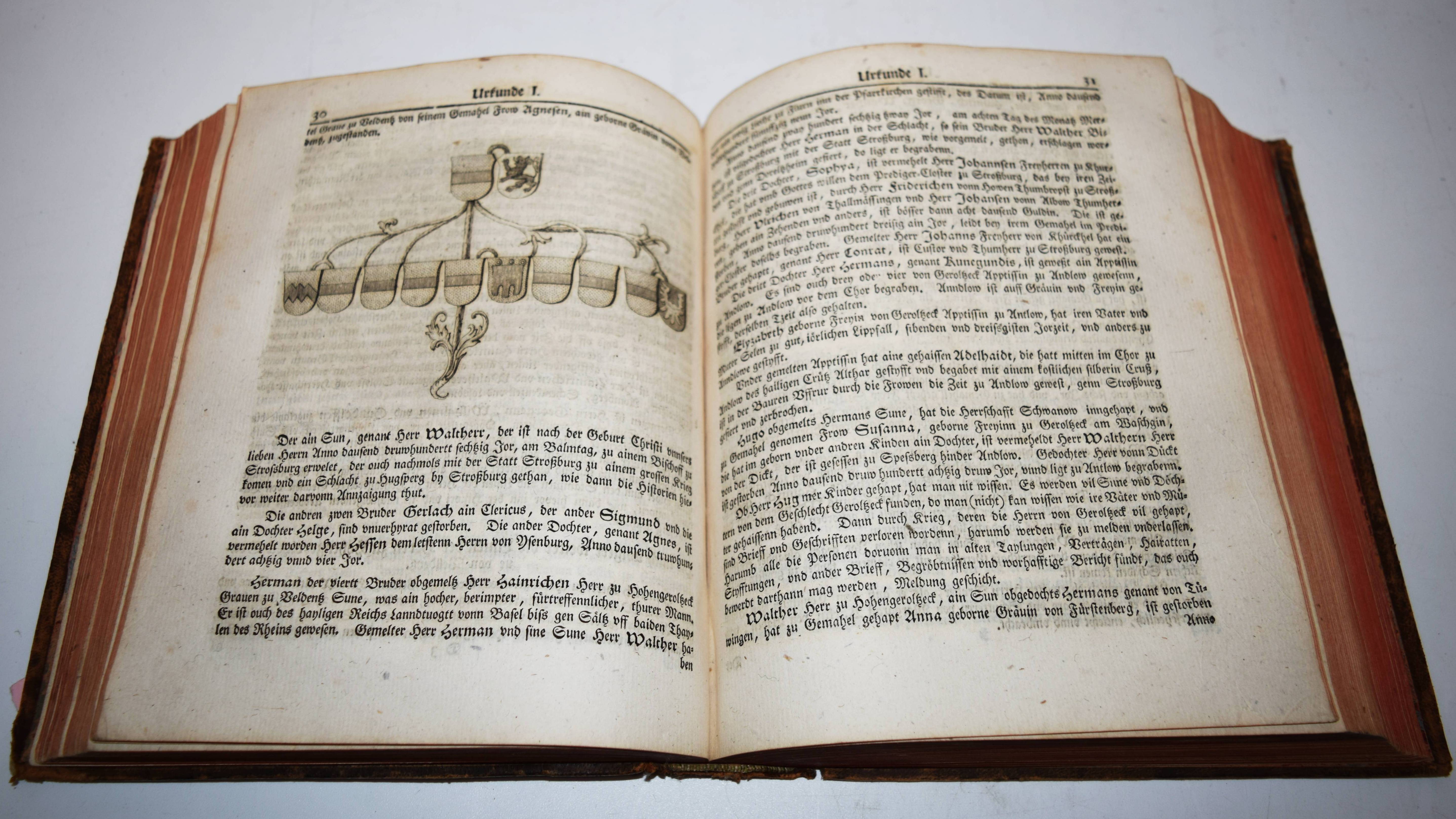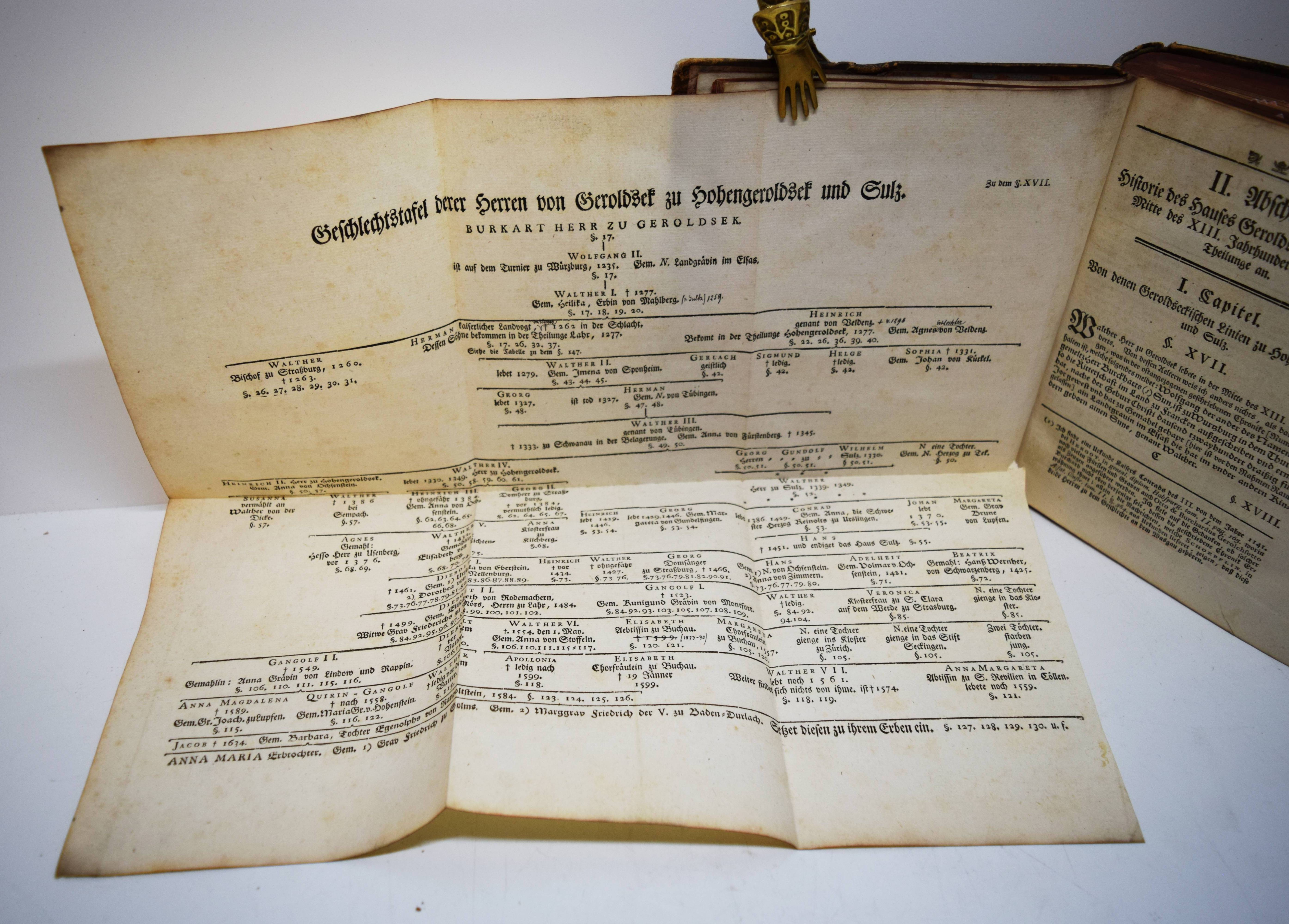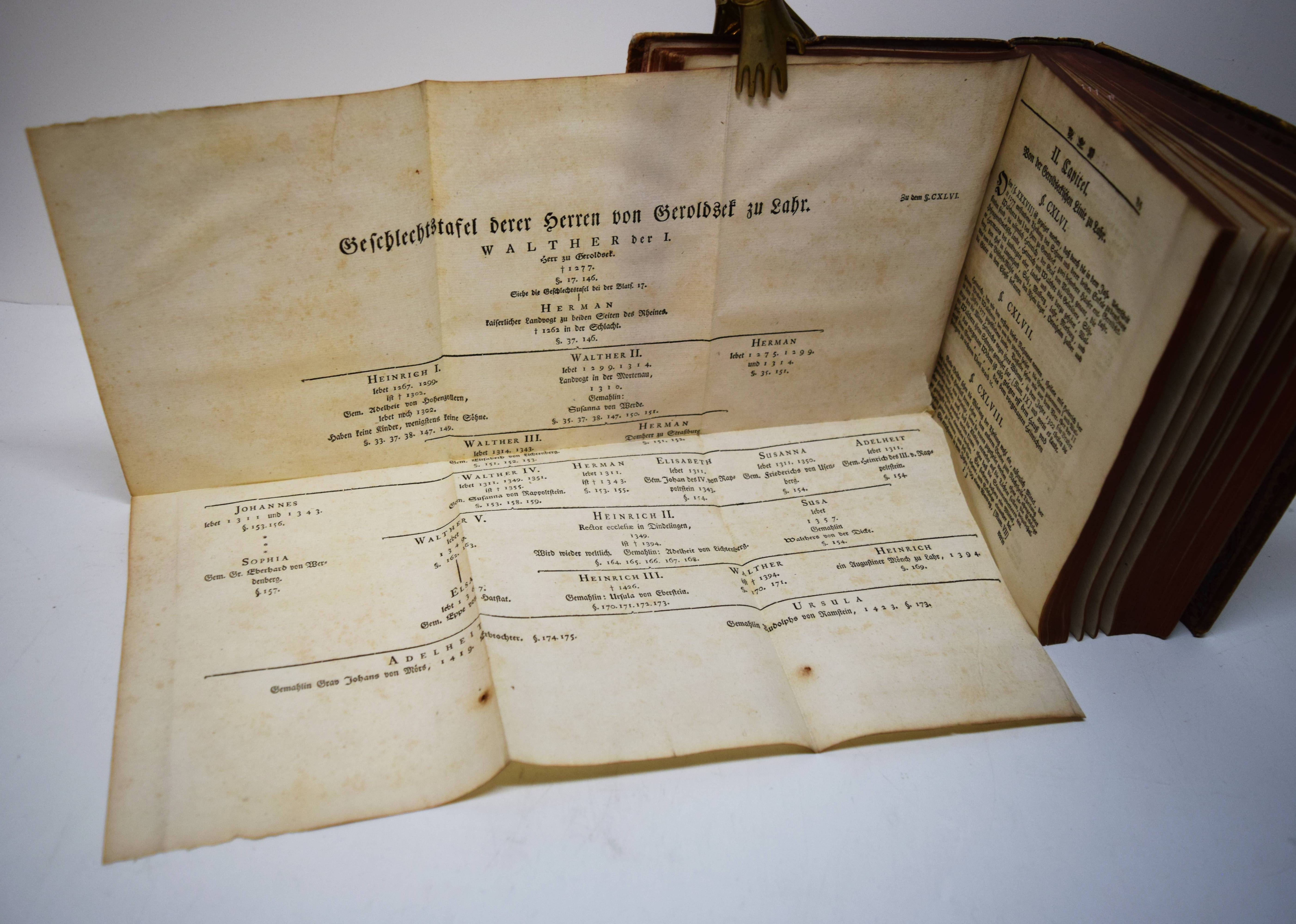 Geroldseck – (Reinhard, Johann Jakob oder Christof Jakob Kremer). Pragmatische Geschichte des Hauses Geroldsek wie auch derer Reichsherschaften Hohengeroldsek, Lahr und Mahlberg in Schwaben. Mit CCXIII Urkunden, einigen Kupfern und zweien Registeren. Frankfurt, Leipzig, o. Dr. 1766. 4°. [4] Bl., 175, 472 S. mit 213 Urkunden, 7 gestoch. Wappen und 2 gefalt. Stammtafeln. Kalbslederband der Zeit mit goldgepr. Rückenschild und reicher floraler Rückenvergoldung. ADB IX, 43. Holzmann-Bohatta II, 7032 (nennt als möglichen Verfasser auch Christof Jakob Kremer; vgl. Jöcher-A. III, 857 u. NDB XIII, 6). Lautenschlager 6630. NDB VI, 317. VD18 10528156. – Erste und einzige Ausgabe. – „Das uralte Haus G. (Hohengeroldseck), welches die Kastenvogtei über die Klöster Schuttern und Ettenheimmünster ausübte und 1259 das Augustinerkloster in Lahr gründete, war das mächtigste der Ortenau, sein Gebiet erstreckte sich vom Rhein über den Schwarzwald bis Schwaben“ (A. Kleinschmidt in ADB). – Gelenke und Kanten etwas berieben, hinteres freies Vorsatzblatt fehlt, stellenweise leicht braunfleckig, sehr schönes dekorativ gebundenes Exemplar.