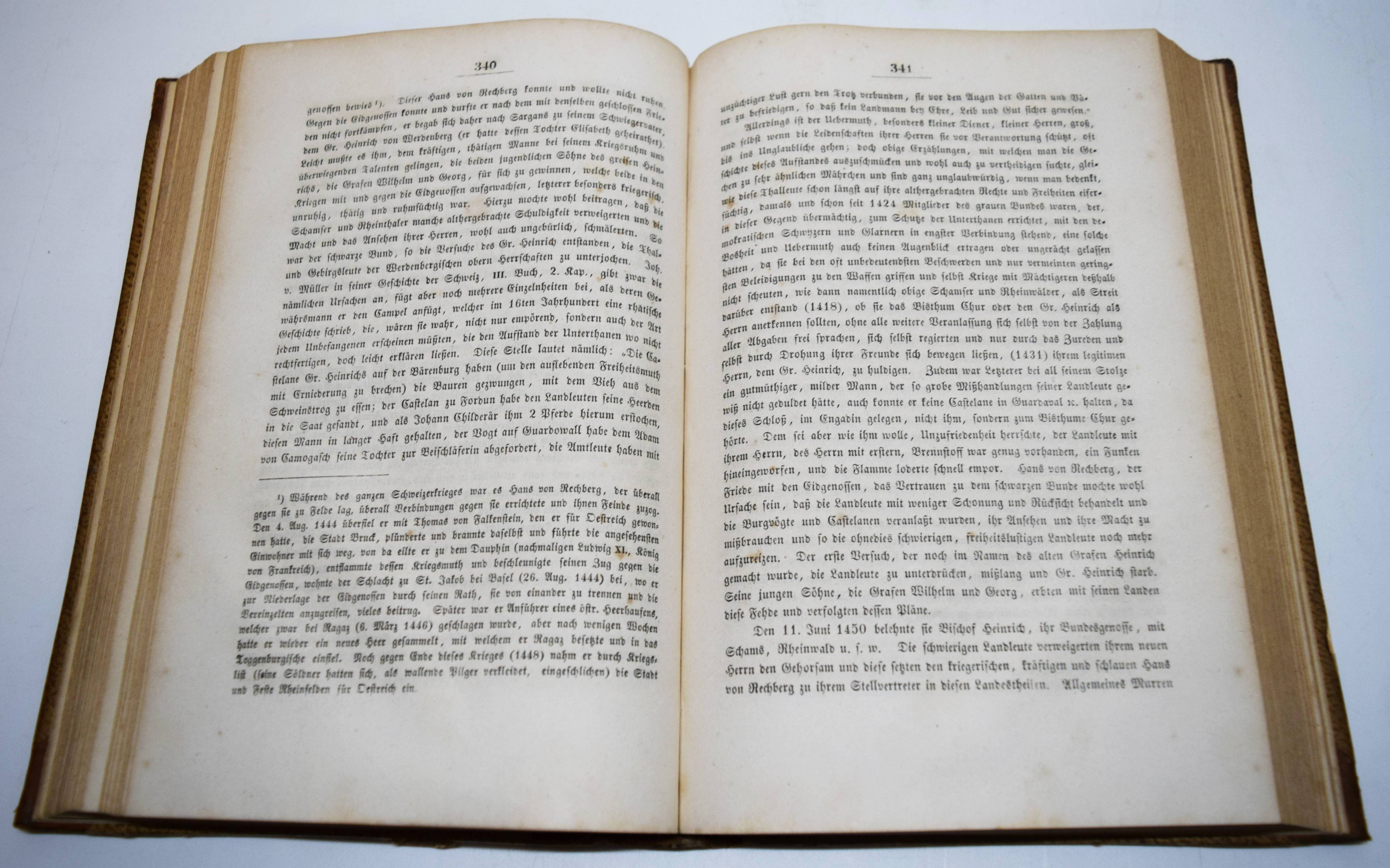 Vanotti, J(ohann) N(epomuk) v. Geschichte der Grafen von Montfort und von Werdenberg. Ein Beitrag zur Geschichte Schwabens, Graubündtens, der Schweiz und des Vorarlbergs. Belle-Vue, bei Constanz, Verlags- und Sortimentsbuchhandlung zu Belle-Vue 1845. Gr.-8° (23 x 15,5 cm.). XXII, 658, (2) S. Halblederband der Zeit mit 2 goldgepr. Rückenschildern. Seltene erste Ausgabe. – Ohne die 2 heraldischen und 8 genealogischen Tafeln, Stempel auf dem Titelblatt, durchgehend braunfleckig, gutes dekorativ gebundenes Exemplar.
