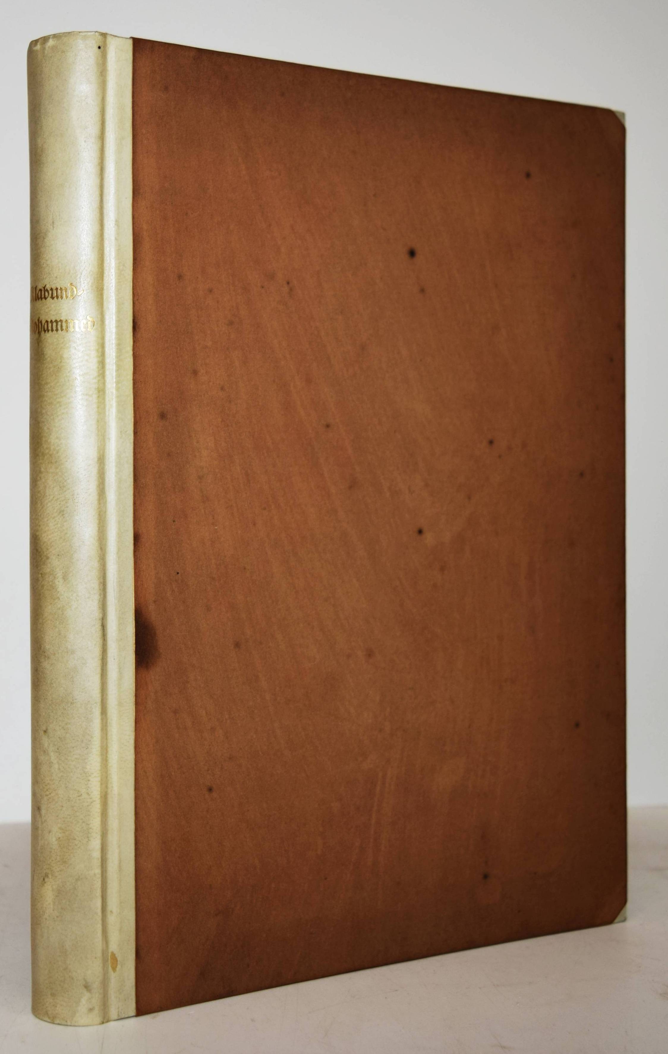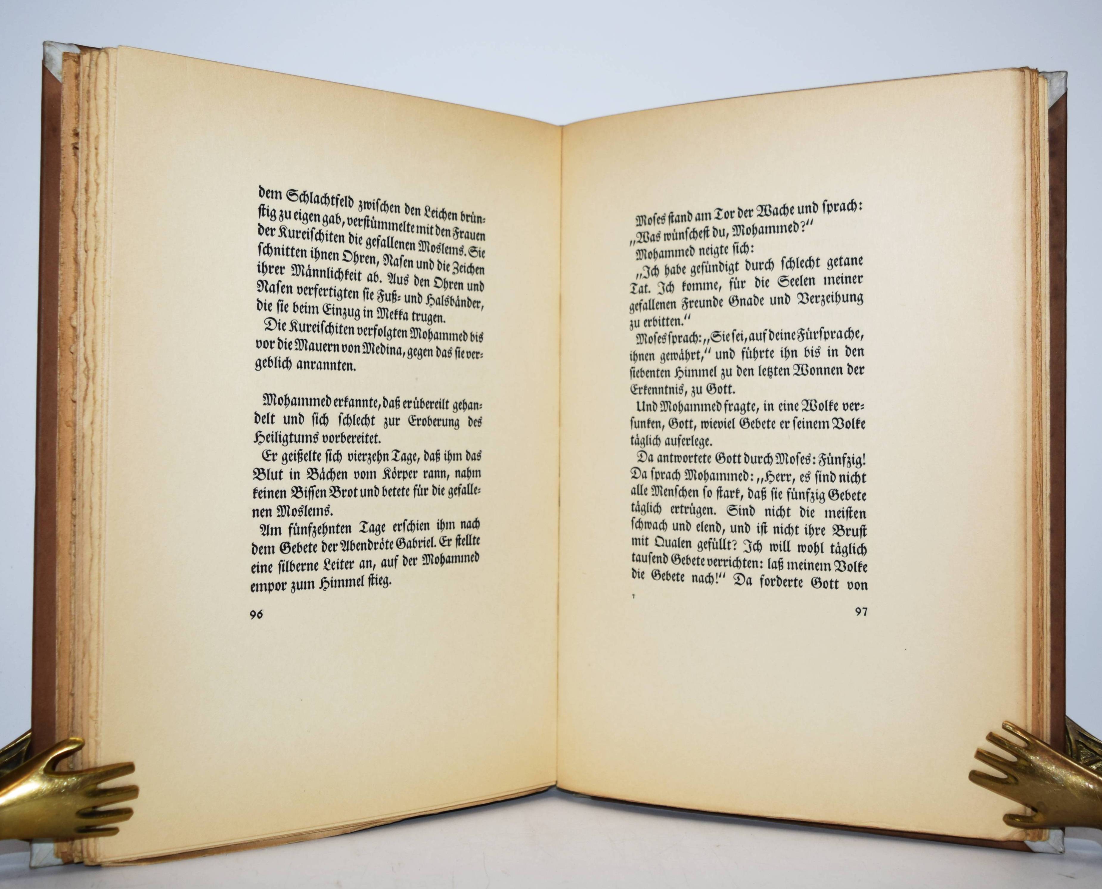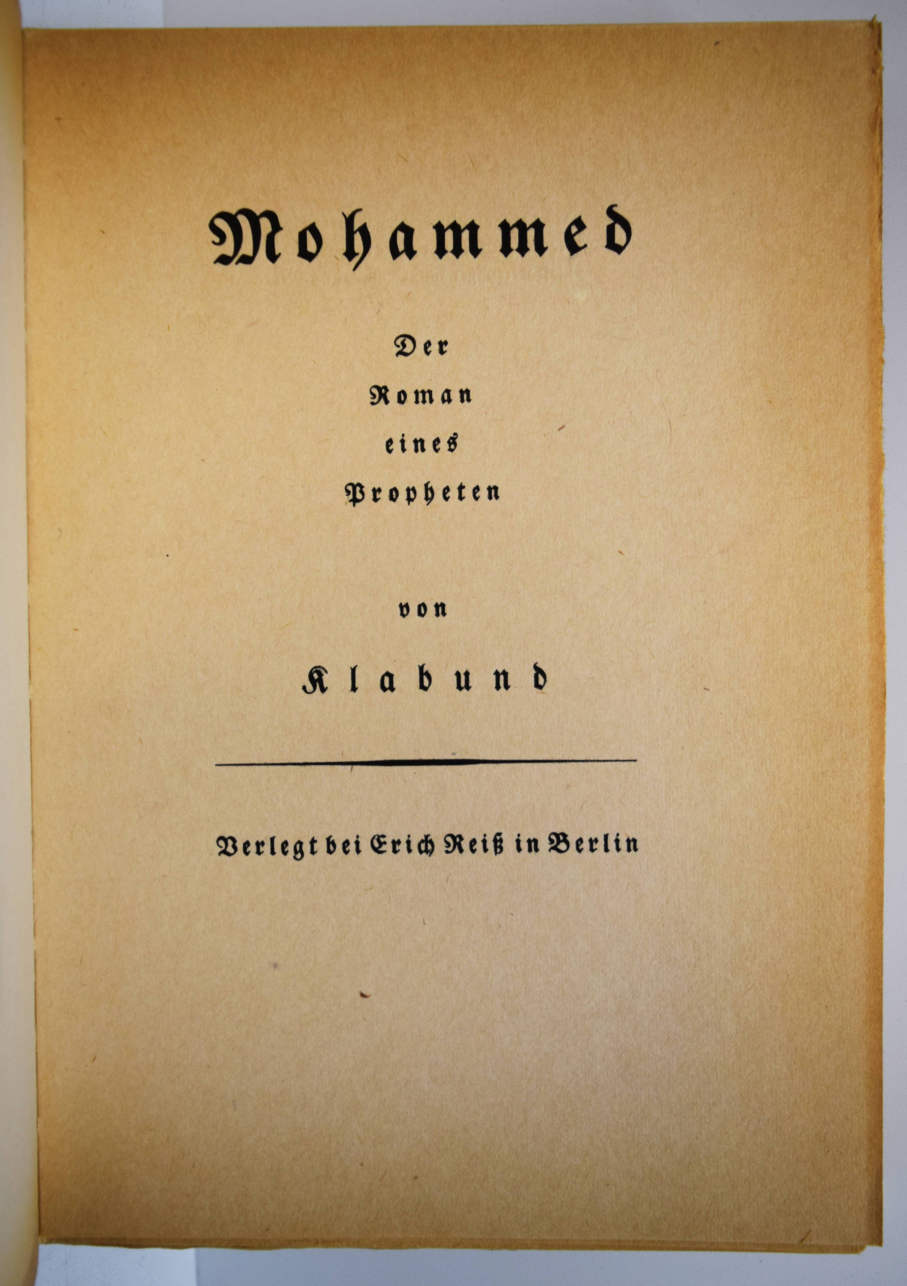 Klabund (d. i. Alfred Georg Hermann „Fredi“ Henschke). Mohammed. Der Roman eines Propheten. Berlin, Erich Reiß 1917. 115 S., [1] Bl. mit 1 Orig.-Lithographie von Max Slevogt und 1 Orig.-Radierung von Hans Meid. Orig.-Halbpergamentband mit goldgepr. Rückentitel. (Prospero-Druck, Band 2). Badorrek-Hoguth 3.12 und Jentsch 261 (Meid). Raabe/Hannich-Bode 158, 11. Rümann 53 und Söhn 36 (Slevogt). W.-G.² 19. – Erste Ausgabe. – Eines von 530 num. Exemplaren (Gesamtauflage 600 Exemplare). – Deckel etwas angestaubt, gutes Exemplar.